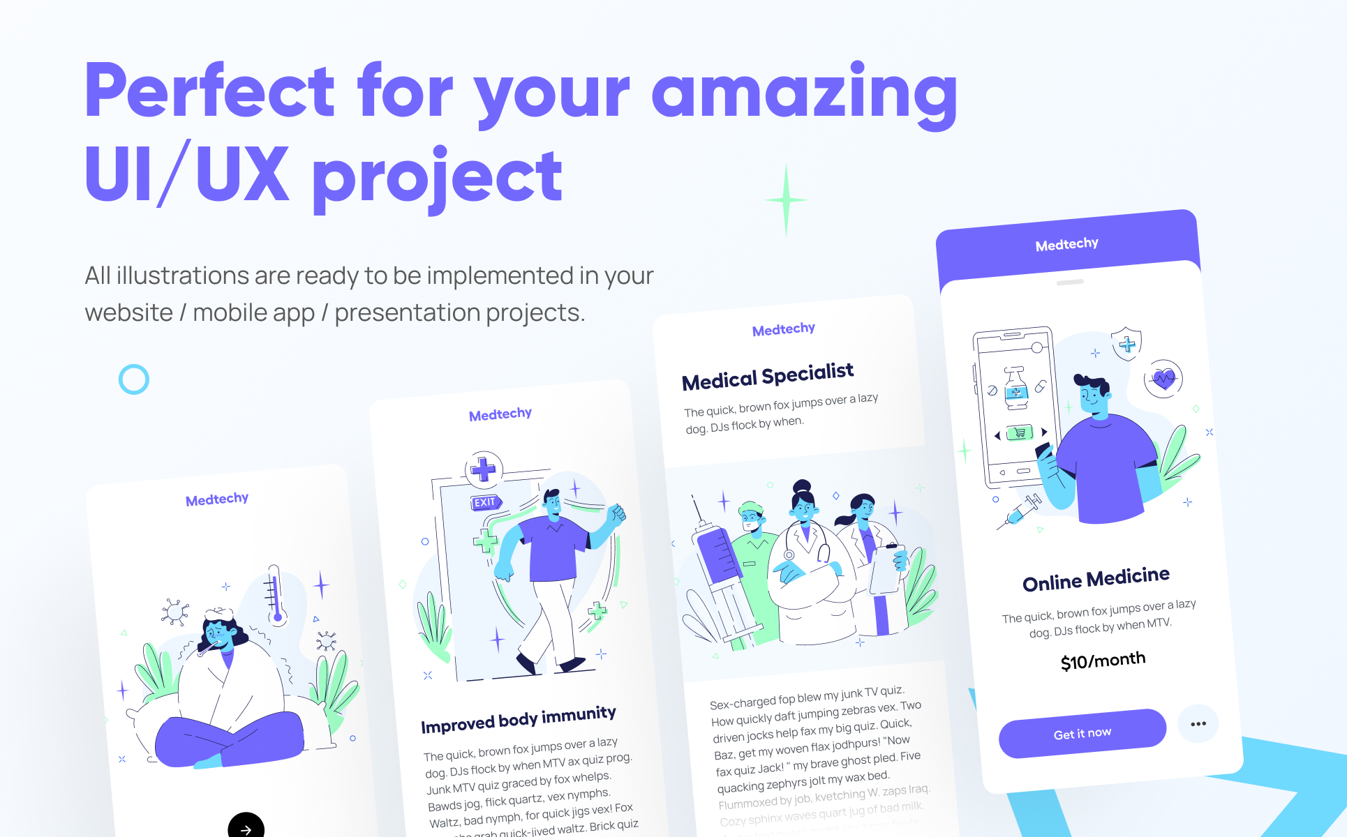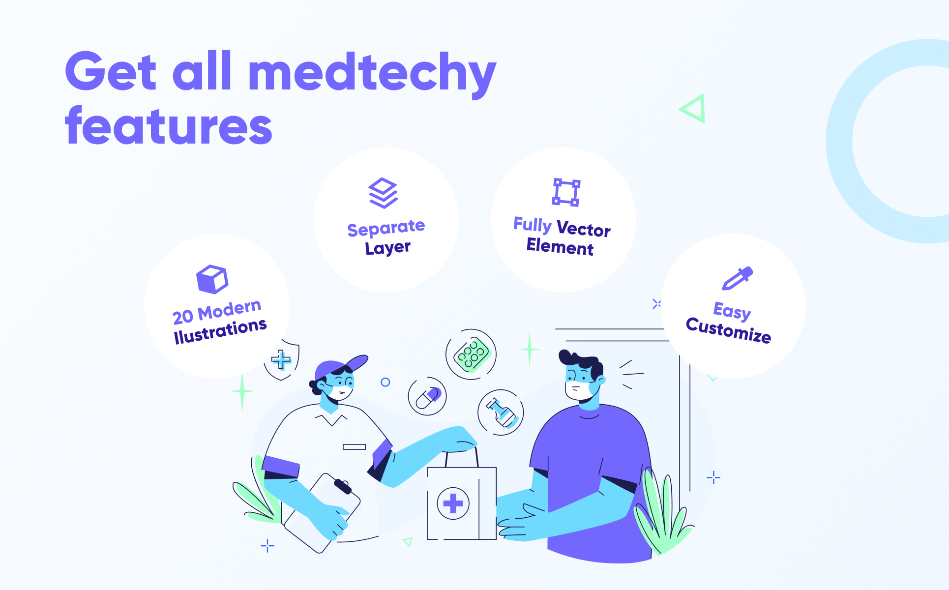 Medtechy is a pack of custom illustration suitable for any Medical & Healthcare niche. Made fully-layered and separated vector objects. Perfect for UI/UX design, presentation, advertising, and many more.