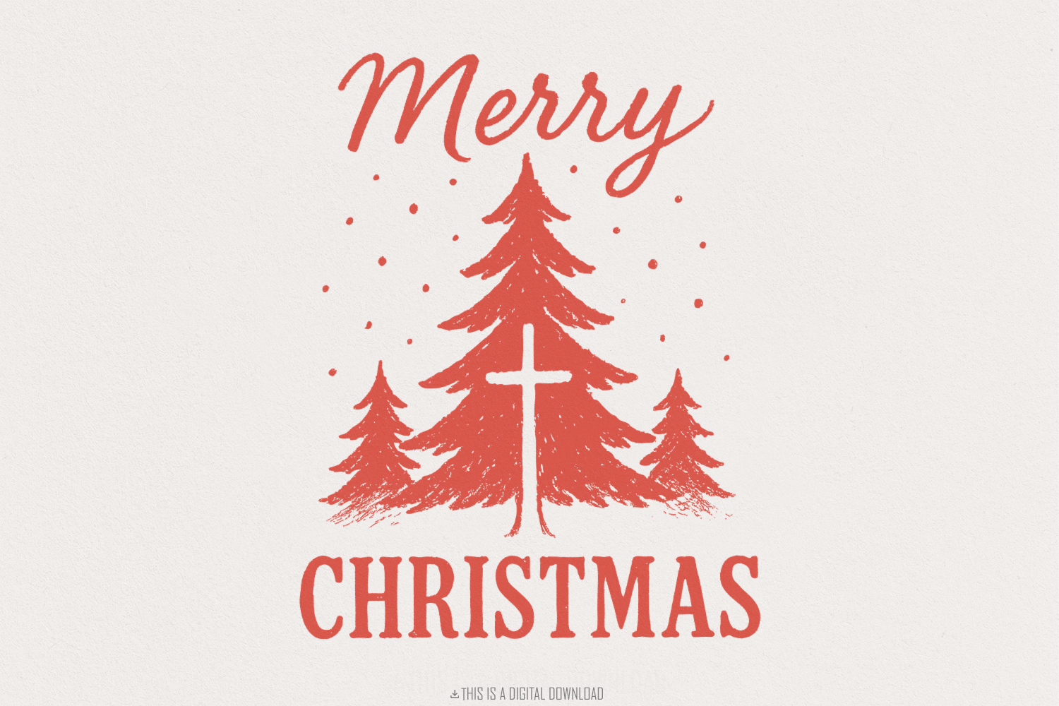 Merry Christmas PNG, Christian Christmas Tree Cross Digital Download, Faith Holiday Shirt Design, Hand Drawn Festive PNG Artwork, Red Winter