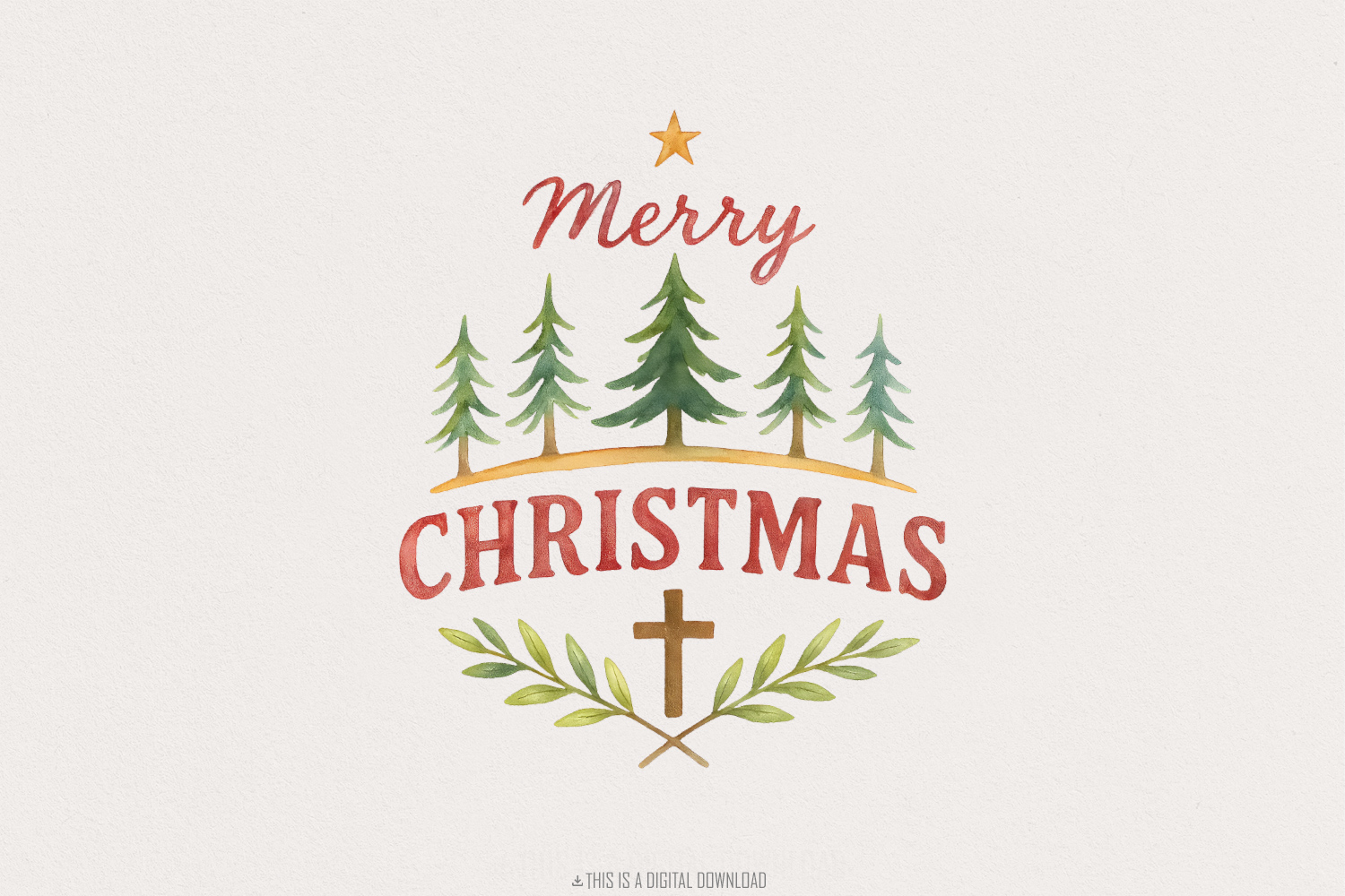 Merry Christmas Watercolor PNG, Christian Christmas Cross PNG, Holiday Digital Download, Christmas Tree PNG, Faith Christmas Art Printable