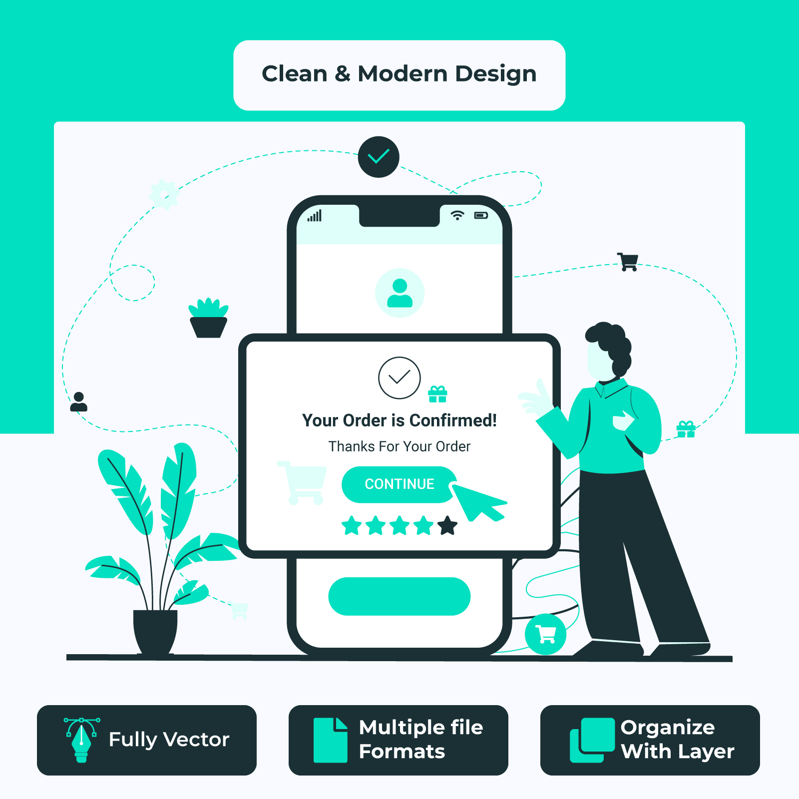 Modern and minimalist illustrations created with Adobe Illustrator are ideal for e-commerce order confirmation messages. This contemporary flat design concept is perfect for online shopping platforms, checkout pages, and customer success screens. The illustrations feature a clean, minimal, professional design with a cohesive color scheme. They are fully resizable and 100% editable.