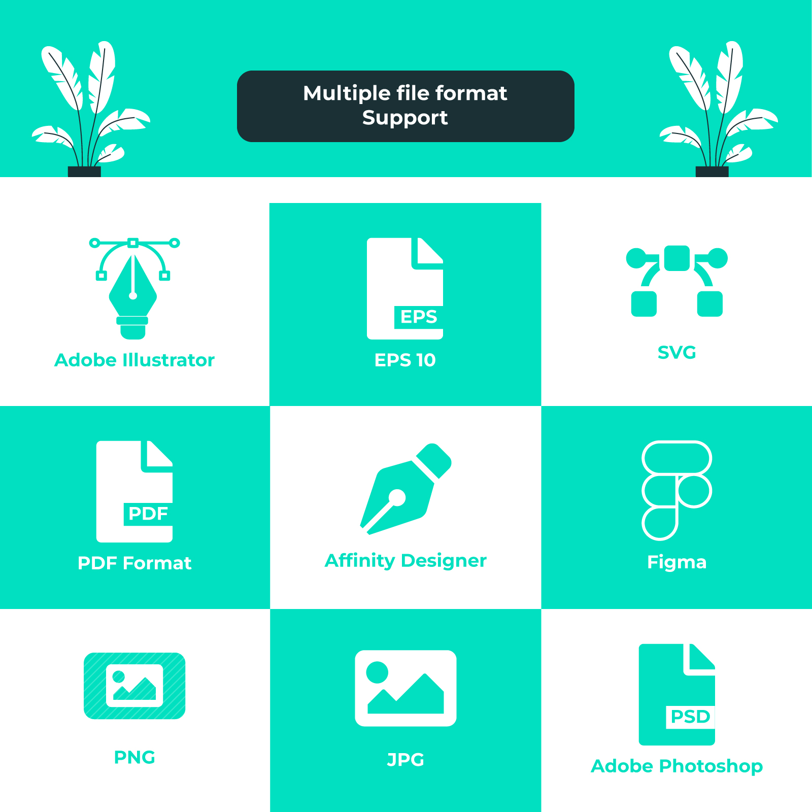 - ✅ 9 unique file format designs (AI, EPS10, SVG, JPG, PNG, PDF, PSD, AFFD, and Figma).