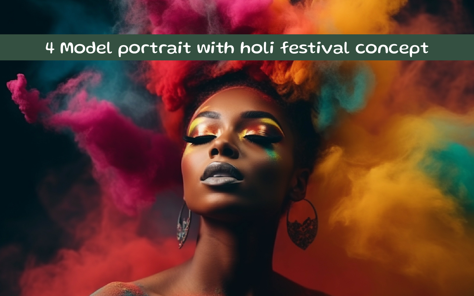 Model portrait with holi festival concept. AI-generated images of female exhibit remarkable creativity and diversity, showcasing a myriad of empowered heroines from various backgrounds and cultures. These images capture the essence of strength, resilience, and determination, fashion, beauty, art, ads, science, robot, technology, portraying female superheroes in dynamic poses and vibrant costumes that inspire awe and admiration.