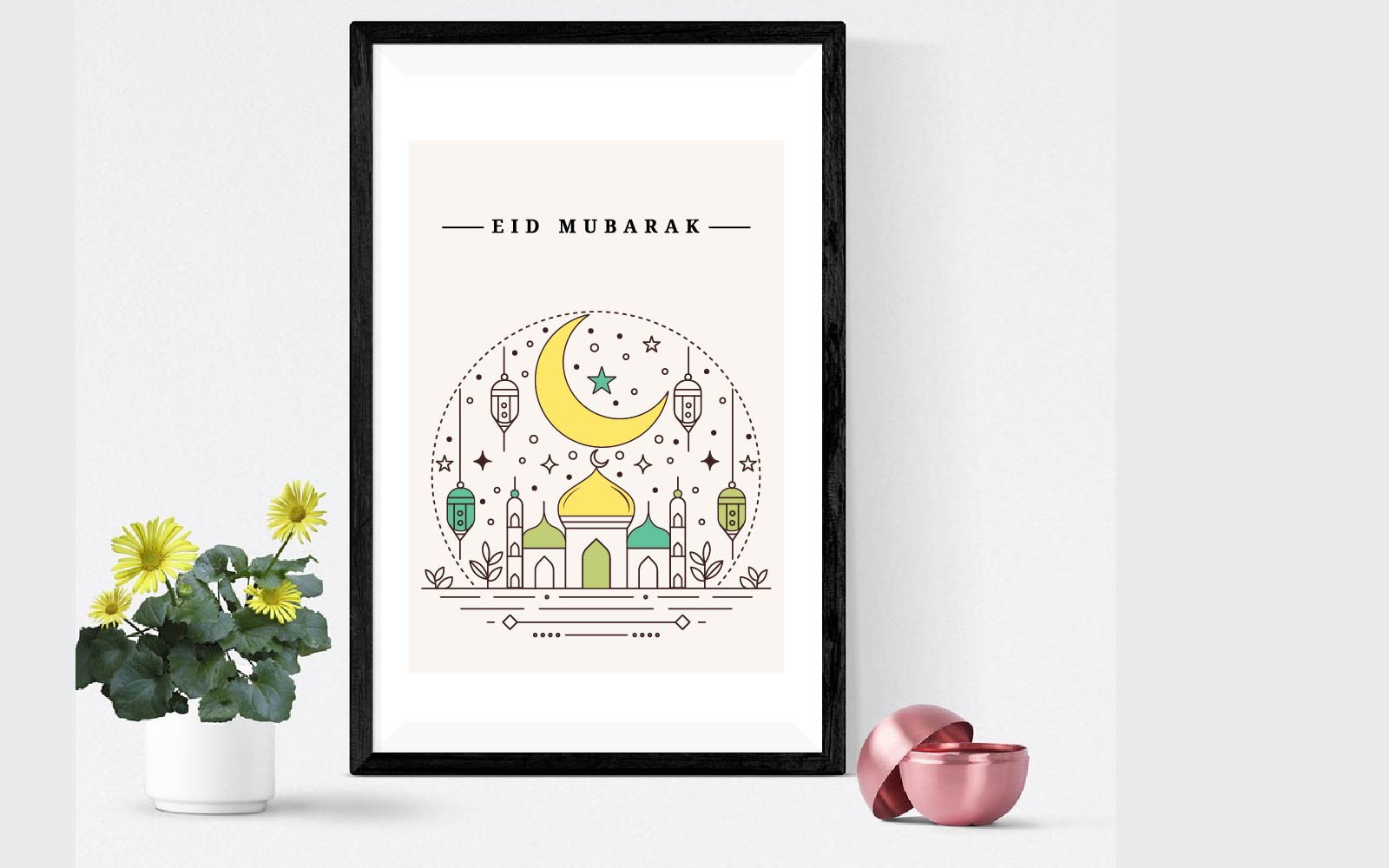 Modern Eid mubarak line art template vector illustration with mosque, crescent, and lantern. Islamic greeting card background design for Ramadan kareem, Eid mubarak, Eid al Fitr, Eid ul adha, etc.