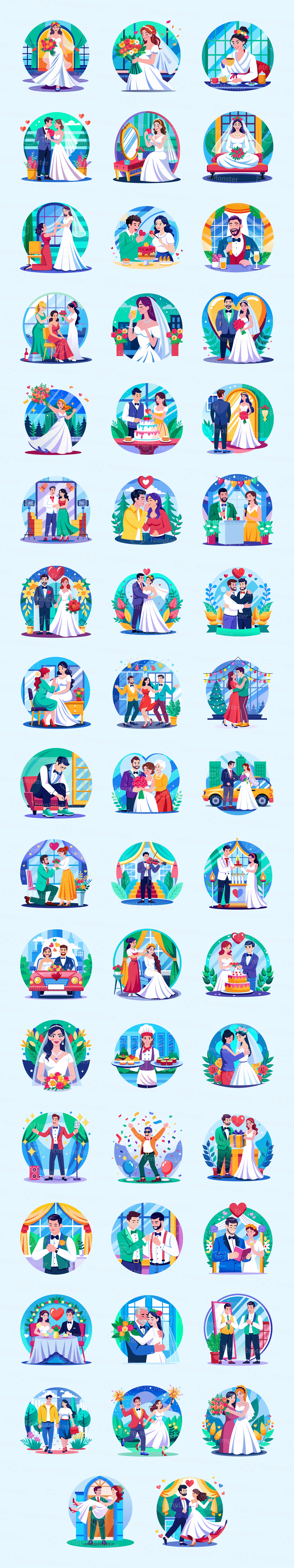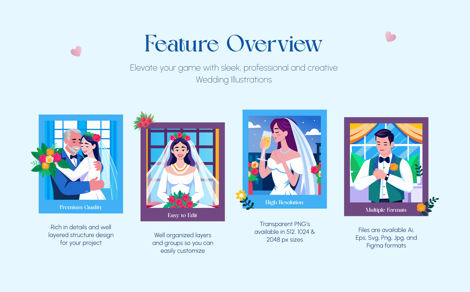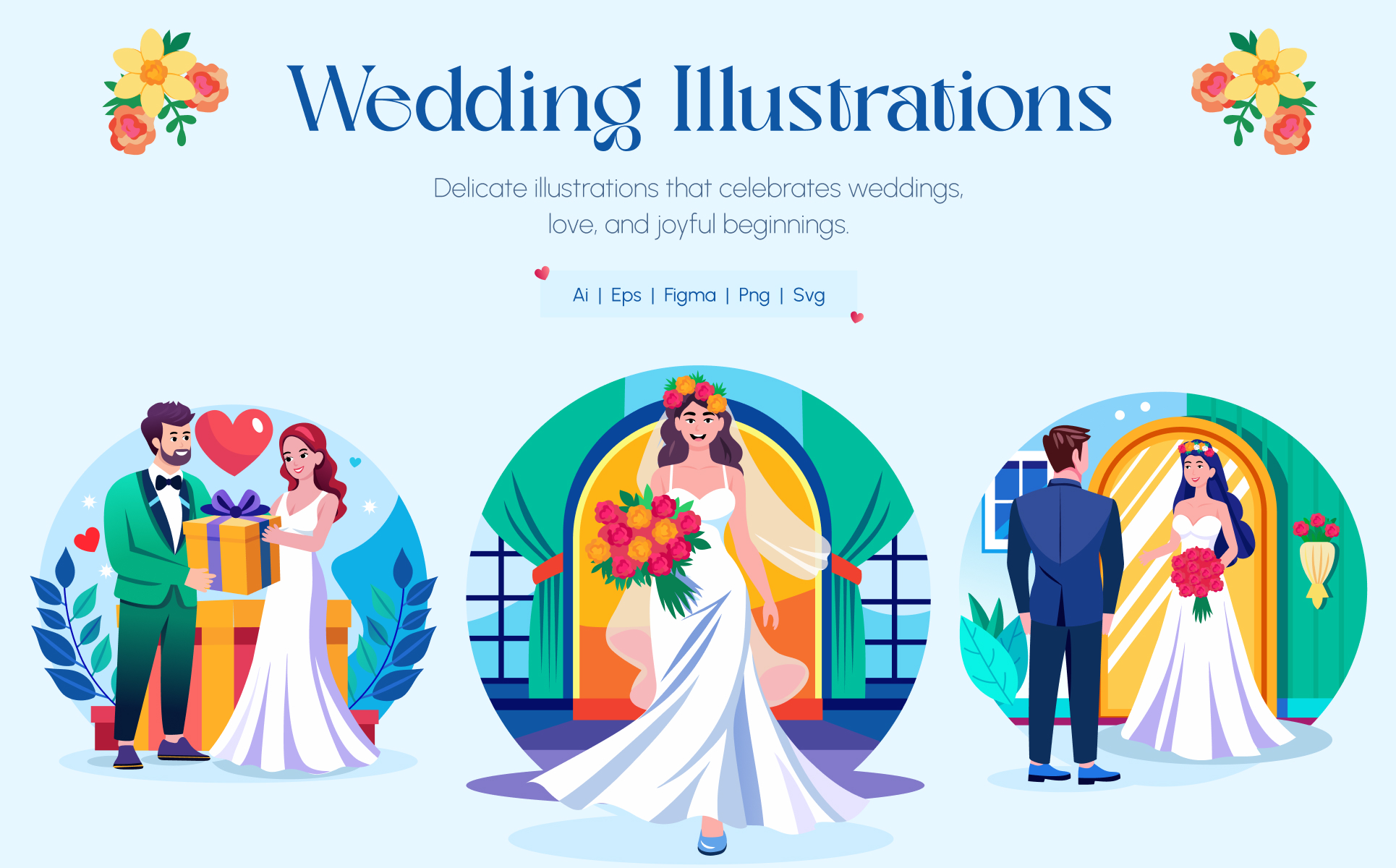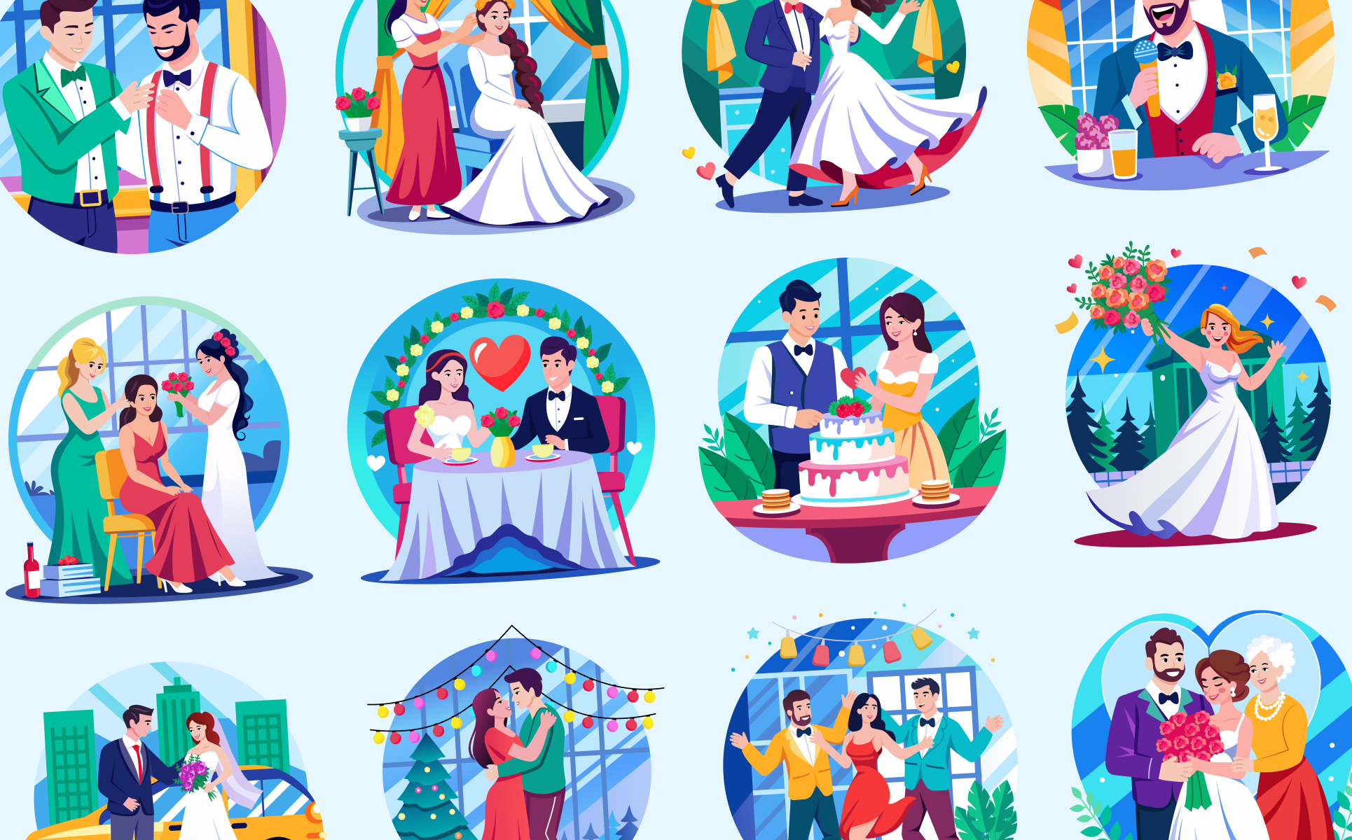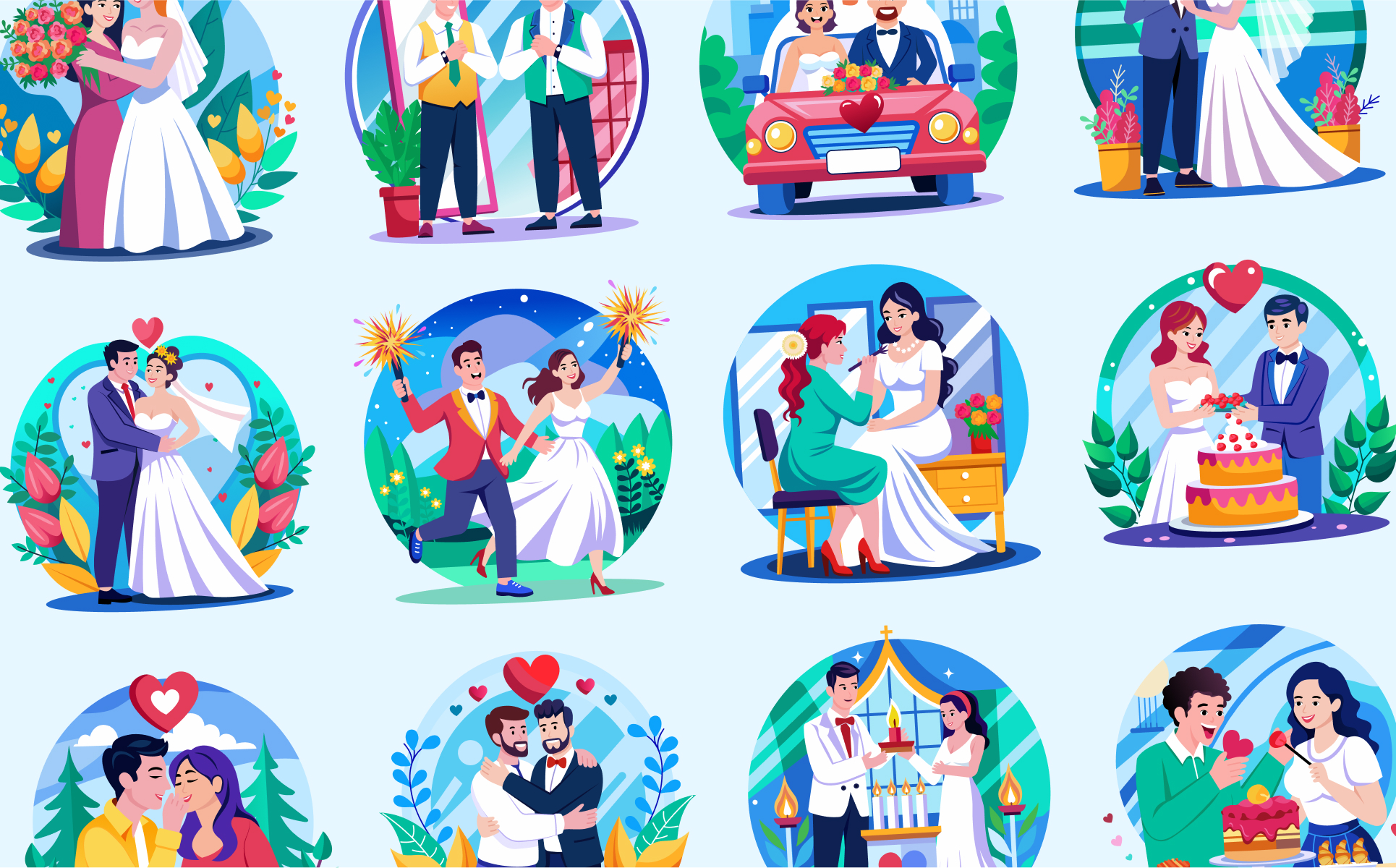 Celebrate the beauty of love and tradition with this Wedding Illustration Art Set. From heartfelt couple moments to intricate cultural rituals, this collection captures the magic of weddings through detailed vector artwork. Whether you're designing invitations, planners, websites, or digital stories, these illustrations add charm, emotion, and elegance to every creation. This set is designed to be as versatile as love itself.