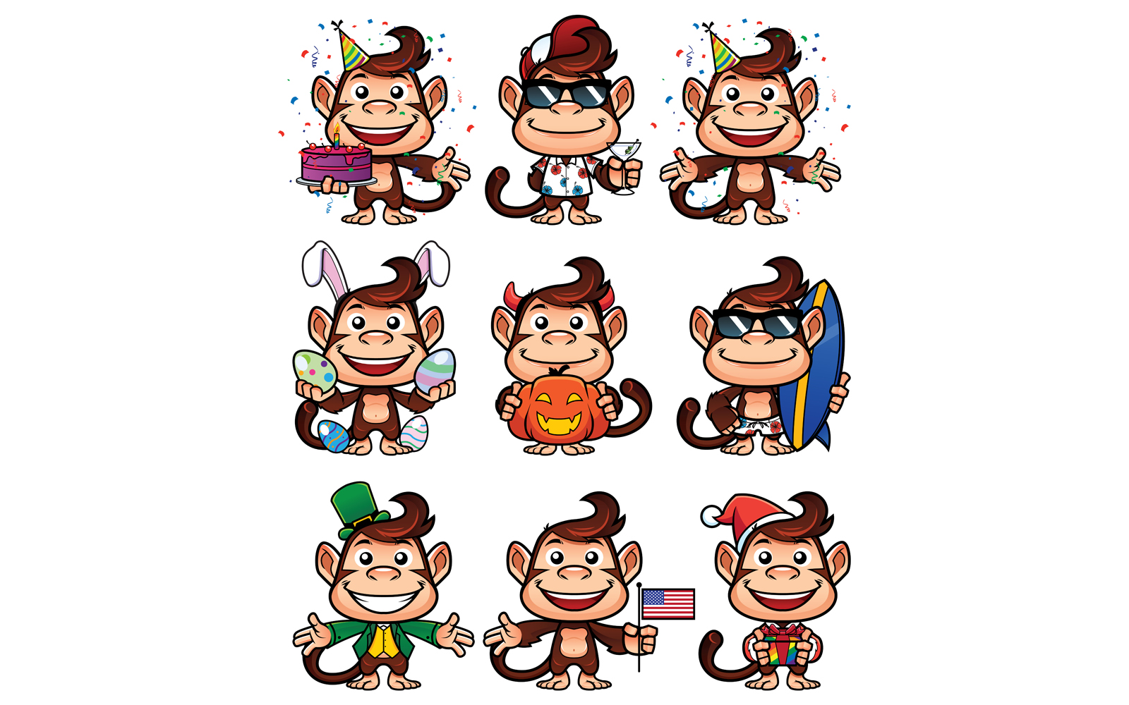 Set of cartoon monkey mascots or avatars for different holidays, isolated on white background.