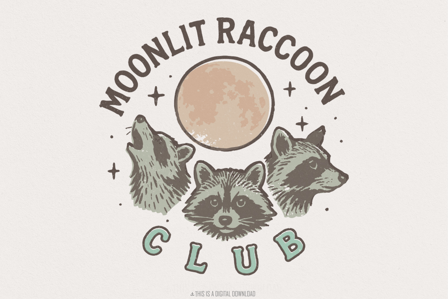 Moonlit Raccoon Club PNG, Retro Raccoon Shirt PNG, Animal Night Moon Art, Hand Drawn Nature, Cute Wildlife Club, Digital Print Download