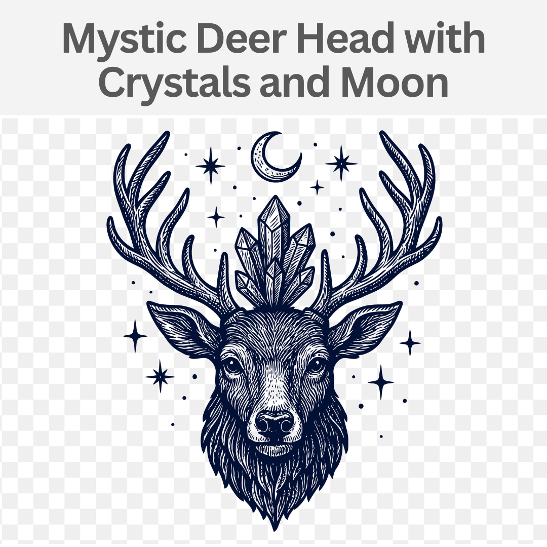 Mystic Deer Head with Crystals and Moon – Vintage Engraved Celestial Animal Art