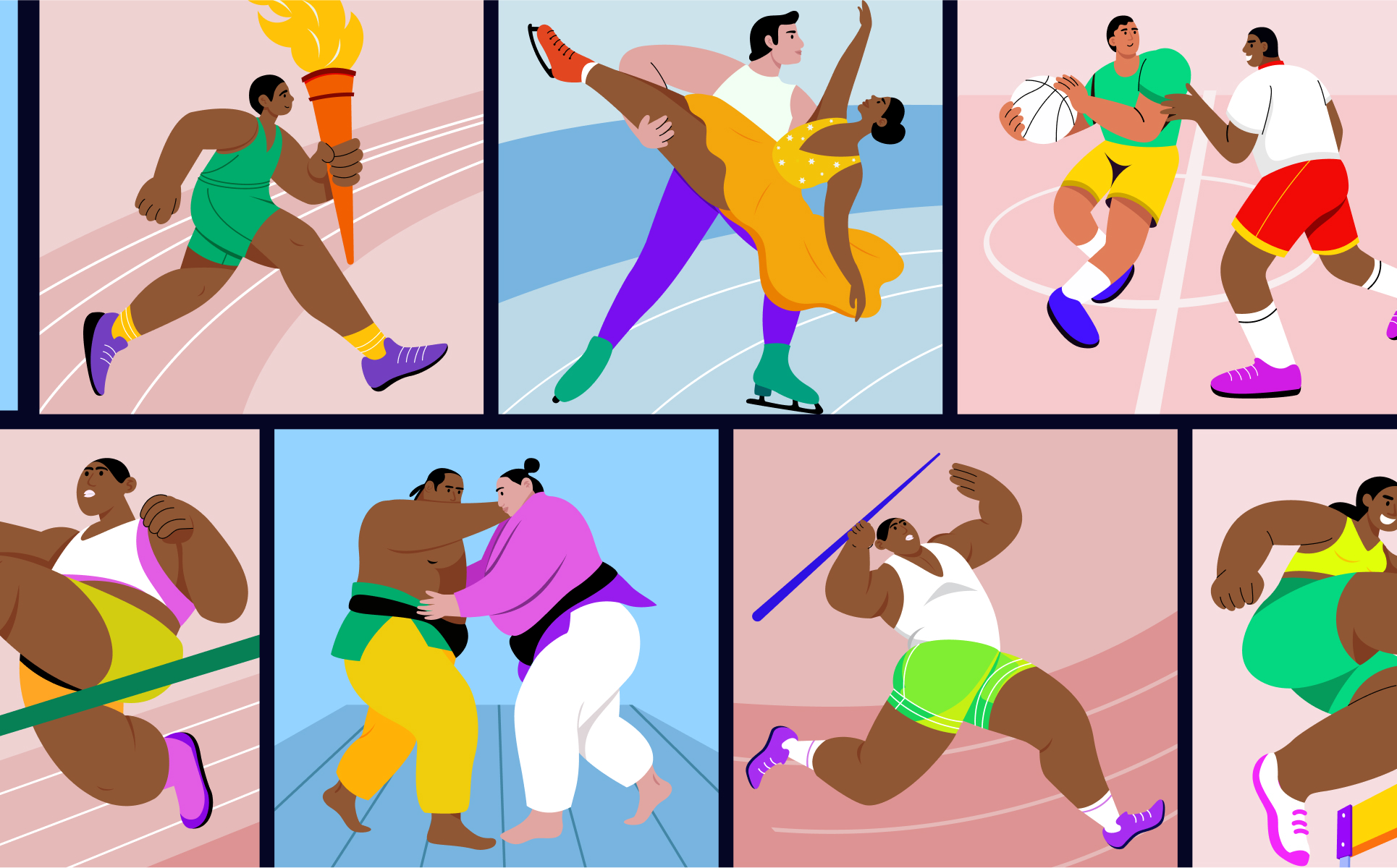 - Includes Olympic athletes, medals, stadiums, and sports elements