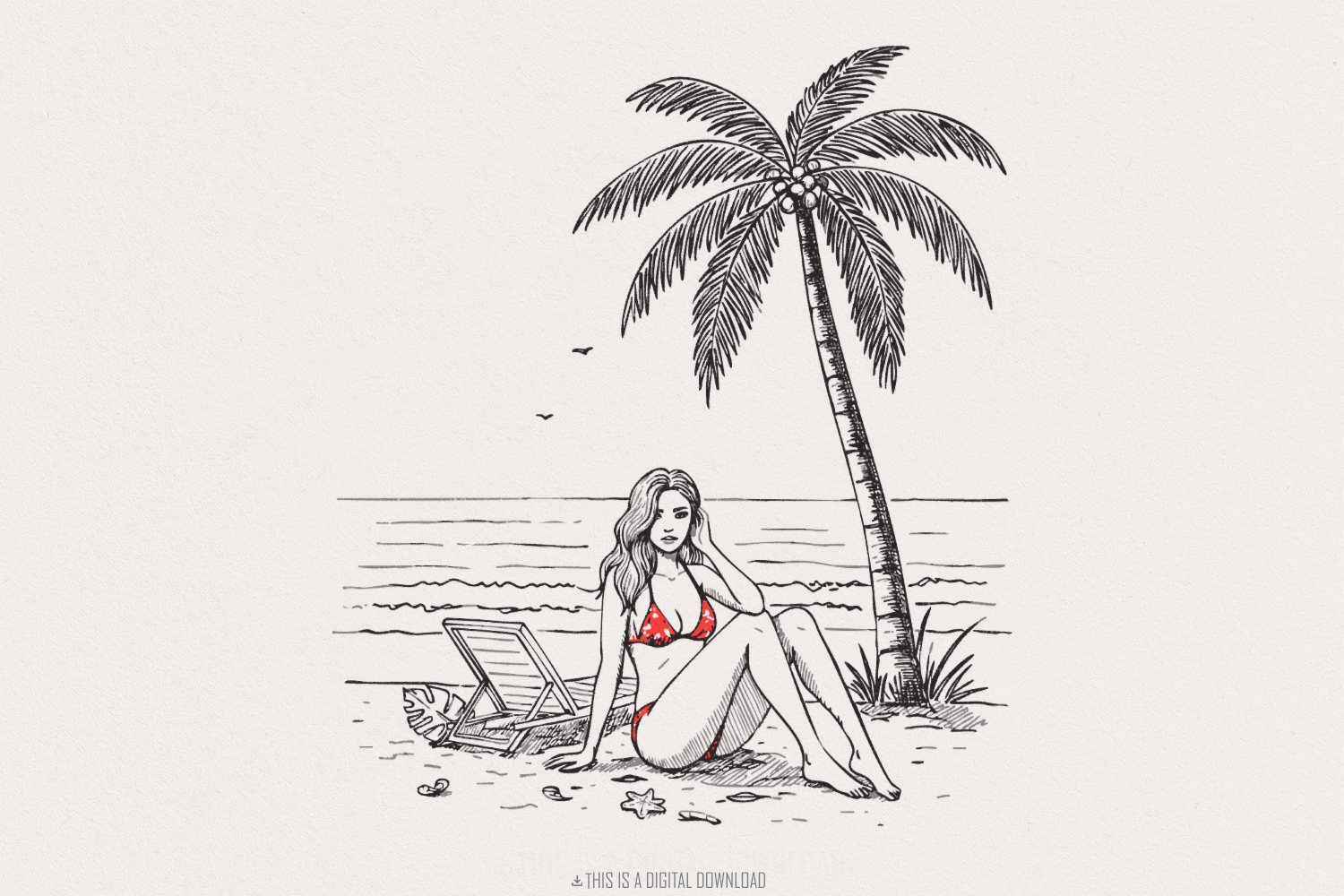 Palm Tree Relaxation PNG, Tropical Beach Scene, Summer Vacation Illustration, Sunbathing Woman Art, Oceanfront Tropical Paradise Design