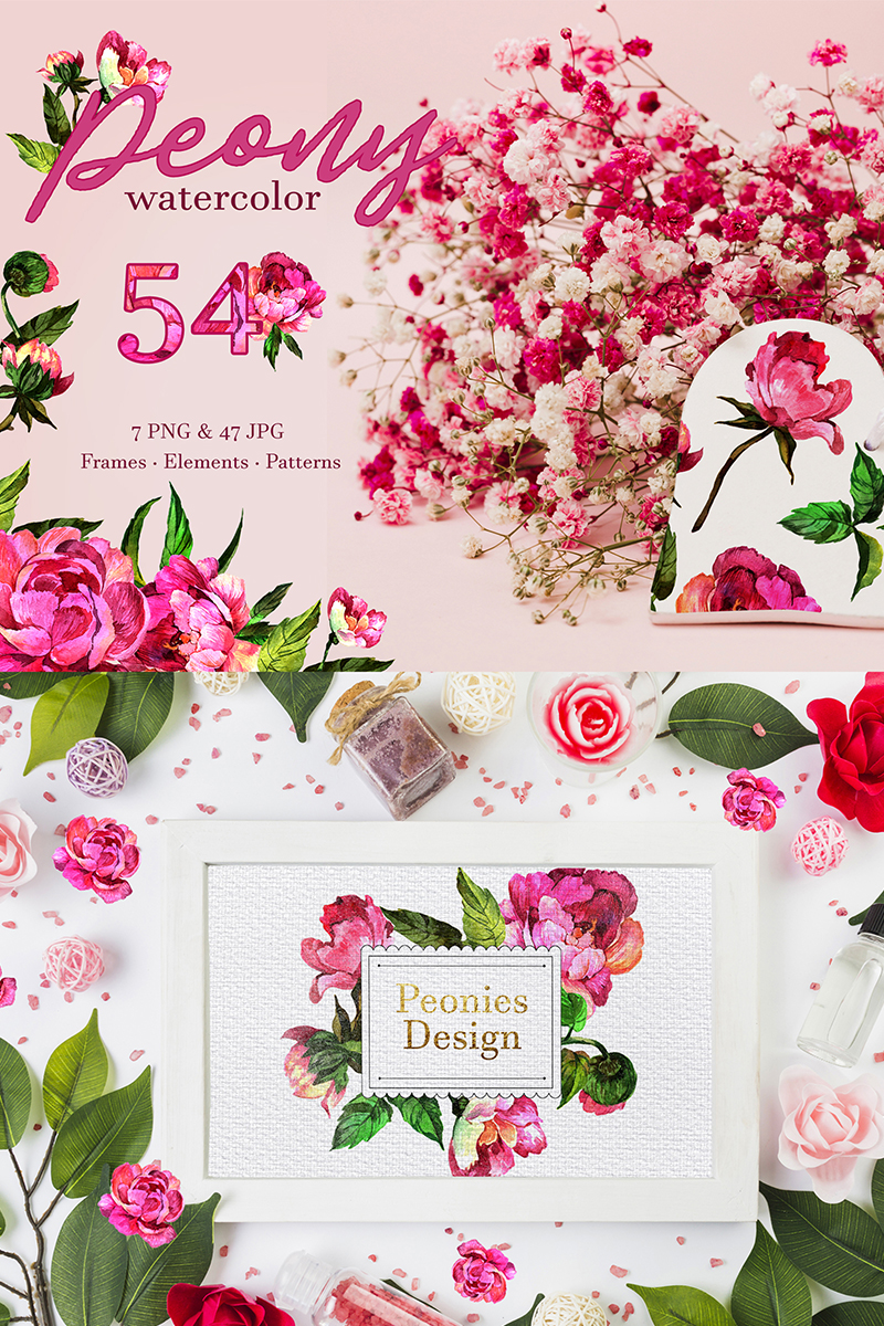 Peony Watercolor pngclipart of 54 files. Ideal material for DIY, wedding invitations, greeting cards, quotes, blogs, posters and more.