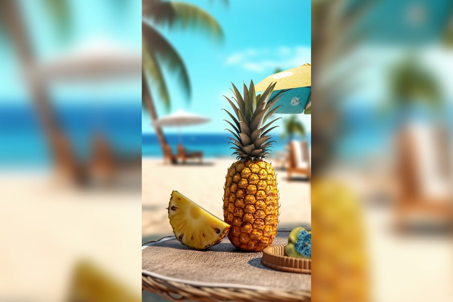 Embracing a minimalistic creative concept, transparent sunglasses and seashells accentuate the essence of summer, while halved pineapples and sunglasses casually placed on the sand exude tropical vibes. As the warmth of a sunny day transitions into a breathtaking sunset behind dry floral plants and mountains, the magic of summer continues to unfold.