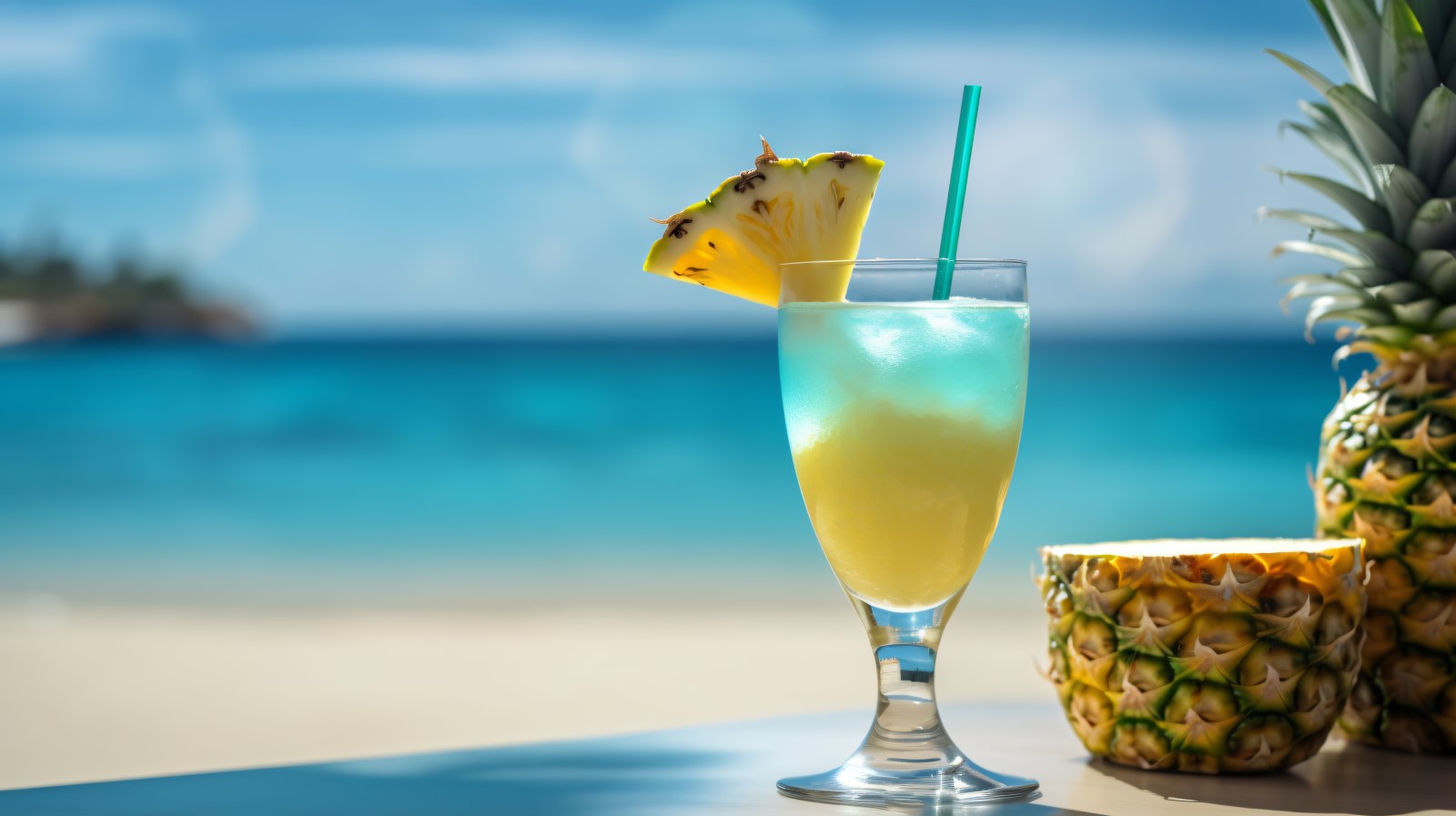 pineapple drink in cocktail glass and sand beach scene 133 Illustration