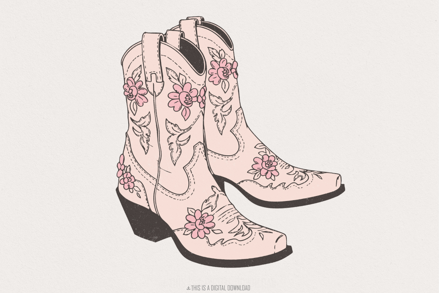 Pink Cowgirl Boots PNG, Floral Western Boots Sublimation Design, Cute Country Girl Clipart, Retro Illustration
