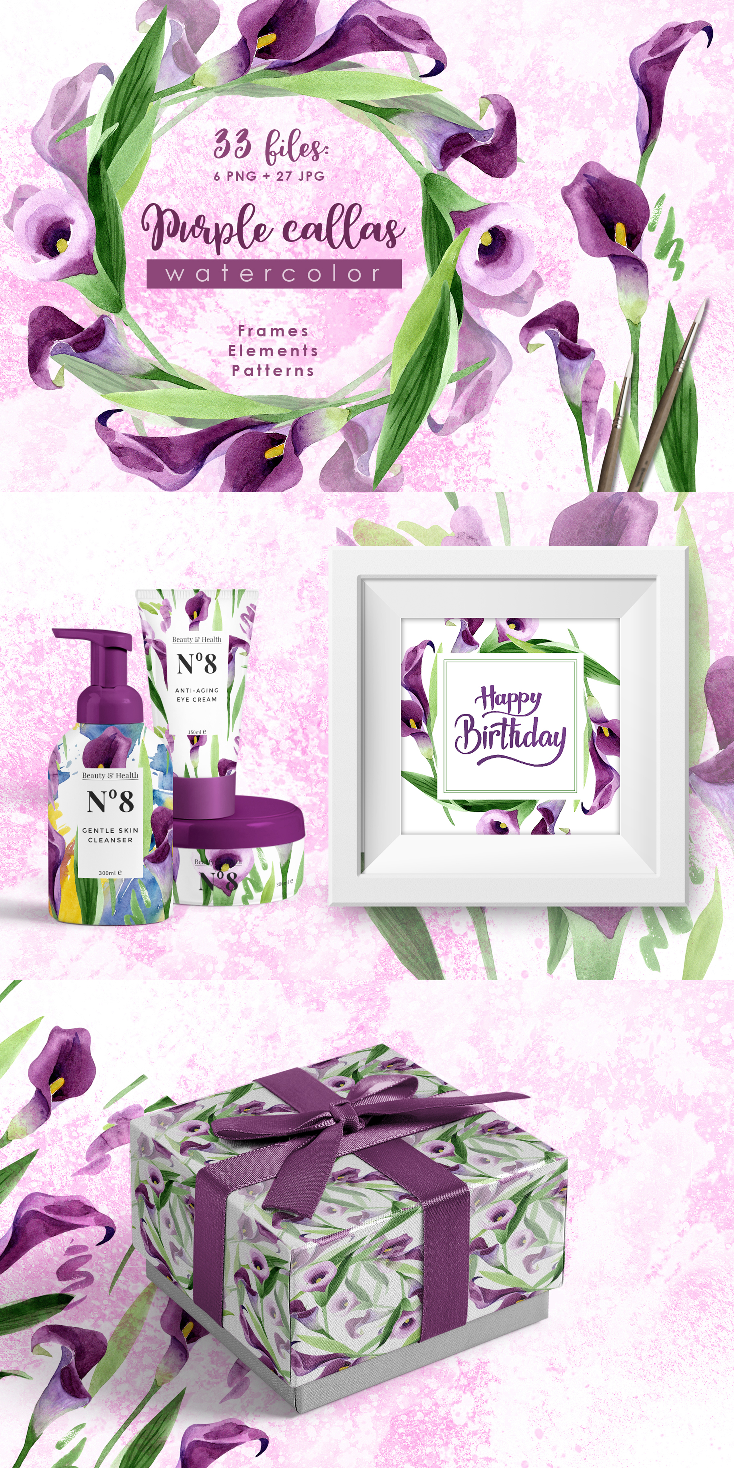 Purple callas Watercolor png clipart of 33 files. Ideal material for DIY, wedding invitations, greeting cards, quotes, blogs, posters and more.