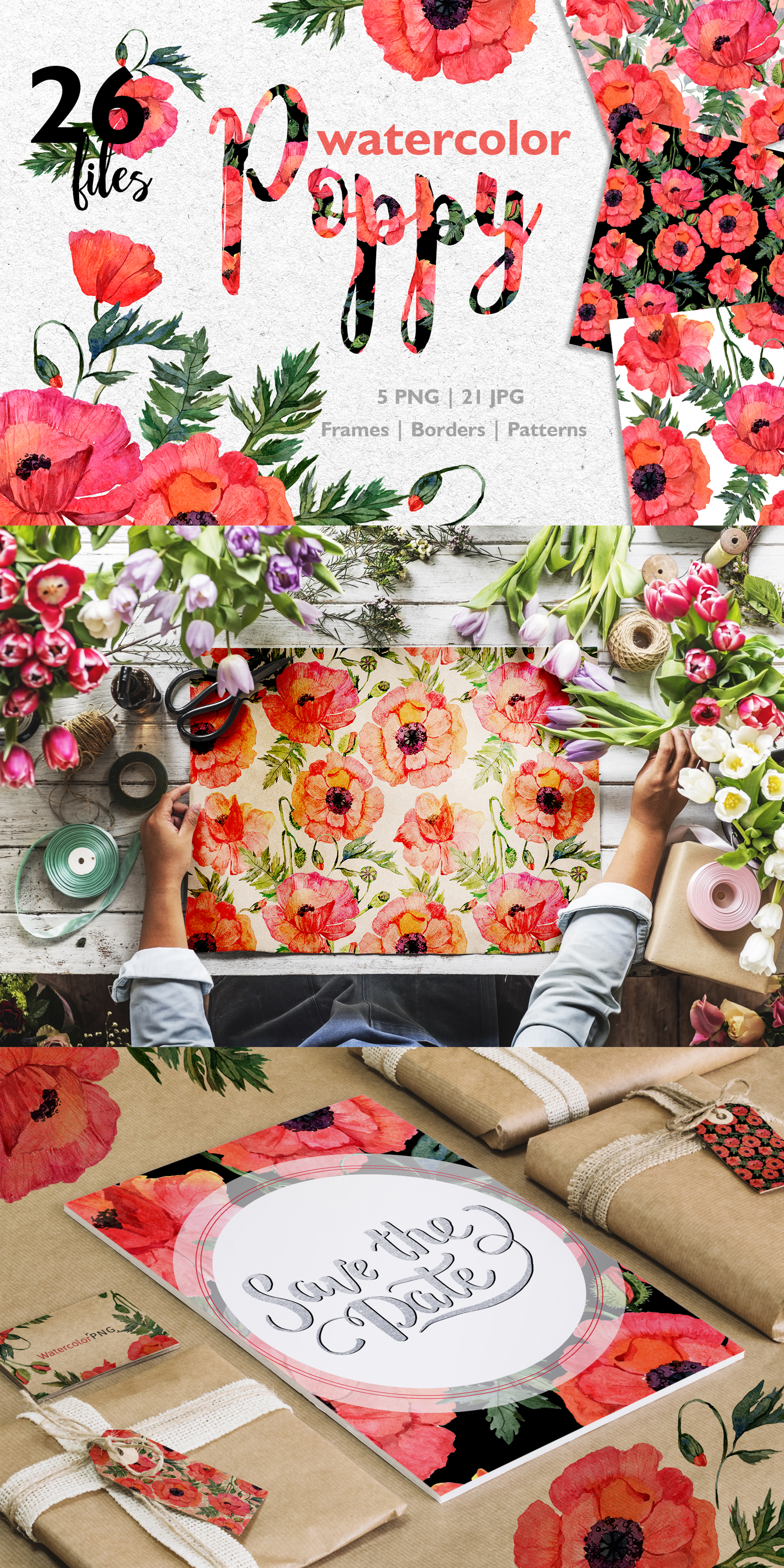 Red Poppy flowers watercolor set of 26 files. Ideal material for DIY, wedding invitations, greeting cards, quotes, blogs, posters and more.
