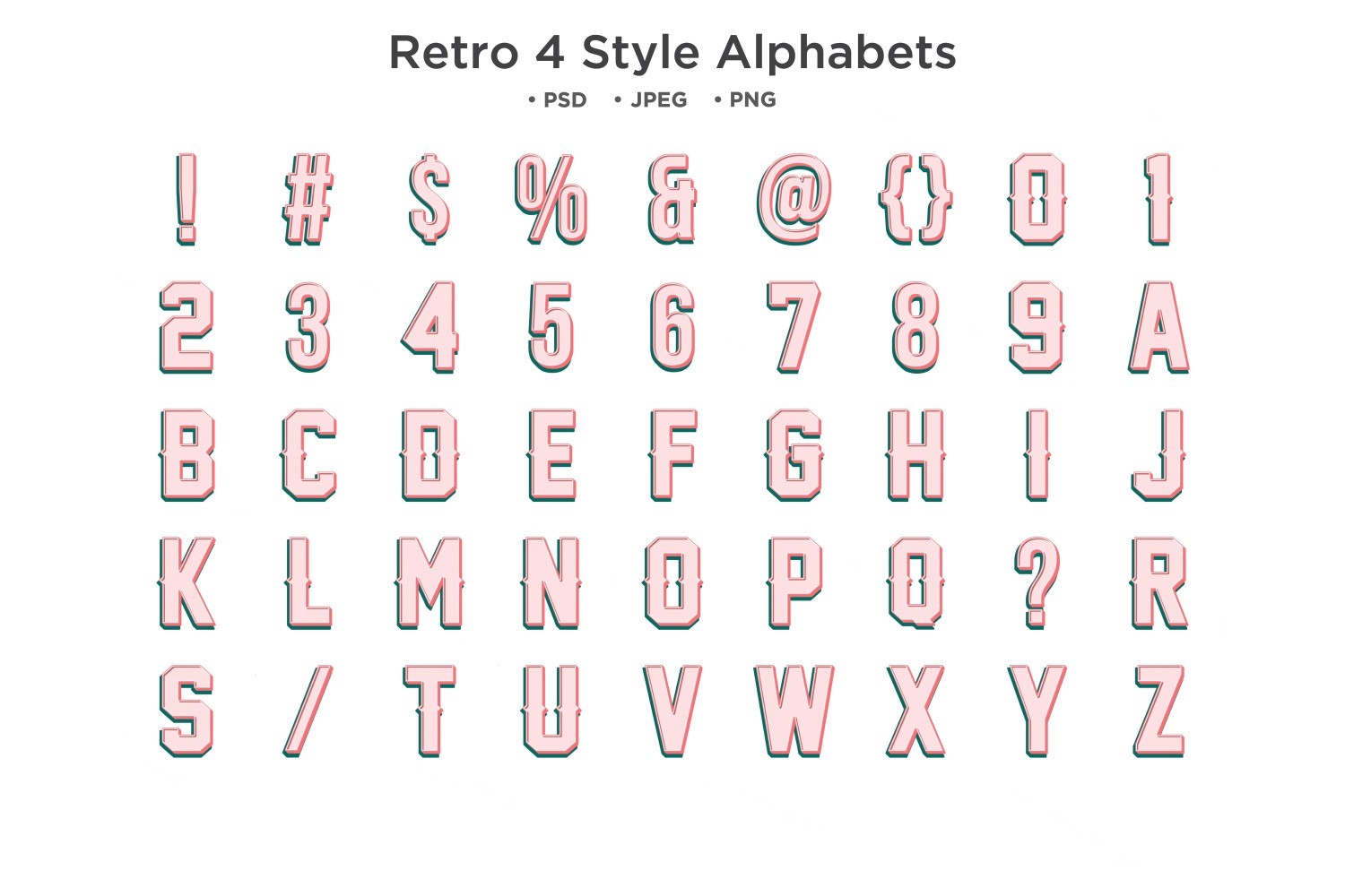 Alphabet, typeface, letters and numbers, typography pack. That includes fully customizable vector alphabet with numbers, the whole pack is very easy to work with; each letter or number is separate PSD file for easy to change text fonts style or color changing. This pack might be very useful to create nostalgic event posters, groovy looking flyers, playful invitations and lots of other awesome things. Have fun using it.