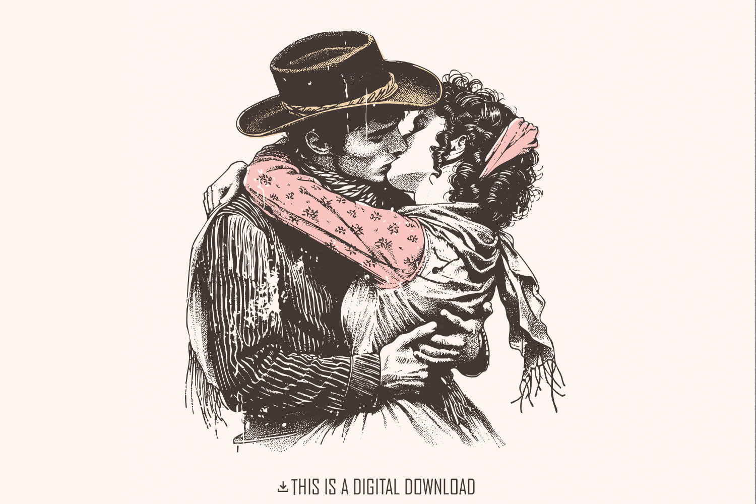 Retro Cowboy Cowgirl Kiss PNG, Vintage Illustration, Digital Download, Trendy Western Valentine,