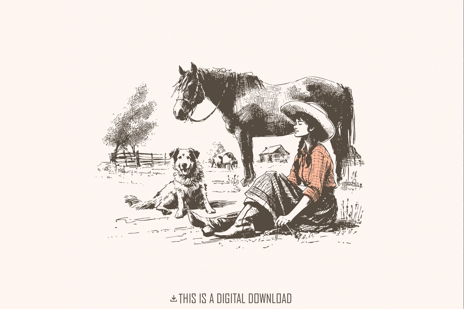 Retro Cowgirl PNG, Western Wild West Digital Download, Cowboy Dog Vintage Farmhouse Design, Country Illustration