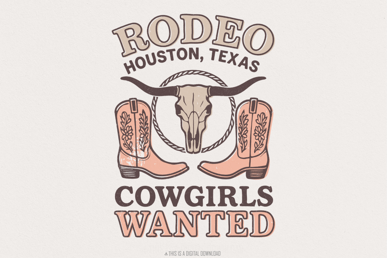 Rodeo Texas Cowgirl Retro PNG, Distressed Cowgirl Boots, Western Skull and Boots Clipart, Country Girl Shirt Art, Retro Cowgirl PNG