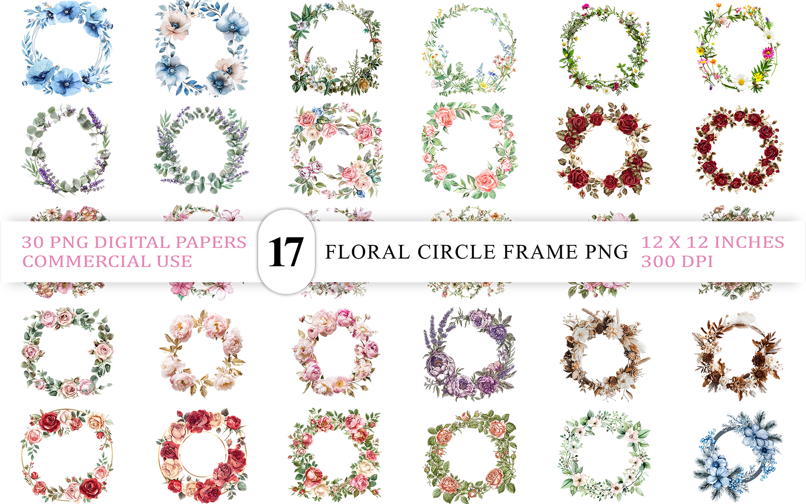 This pack includes 30 Feminine Floral Circle Frame PNG Bundle digital papers/backgrounds.