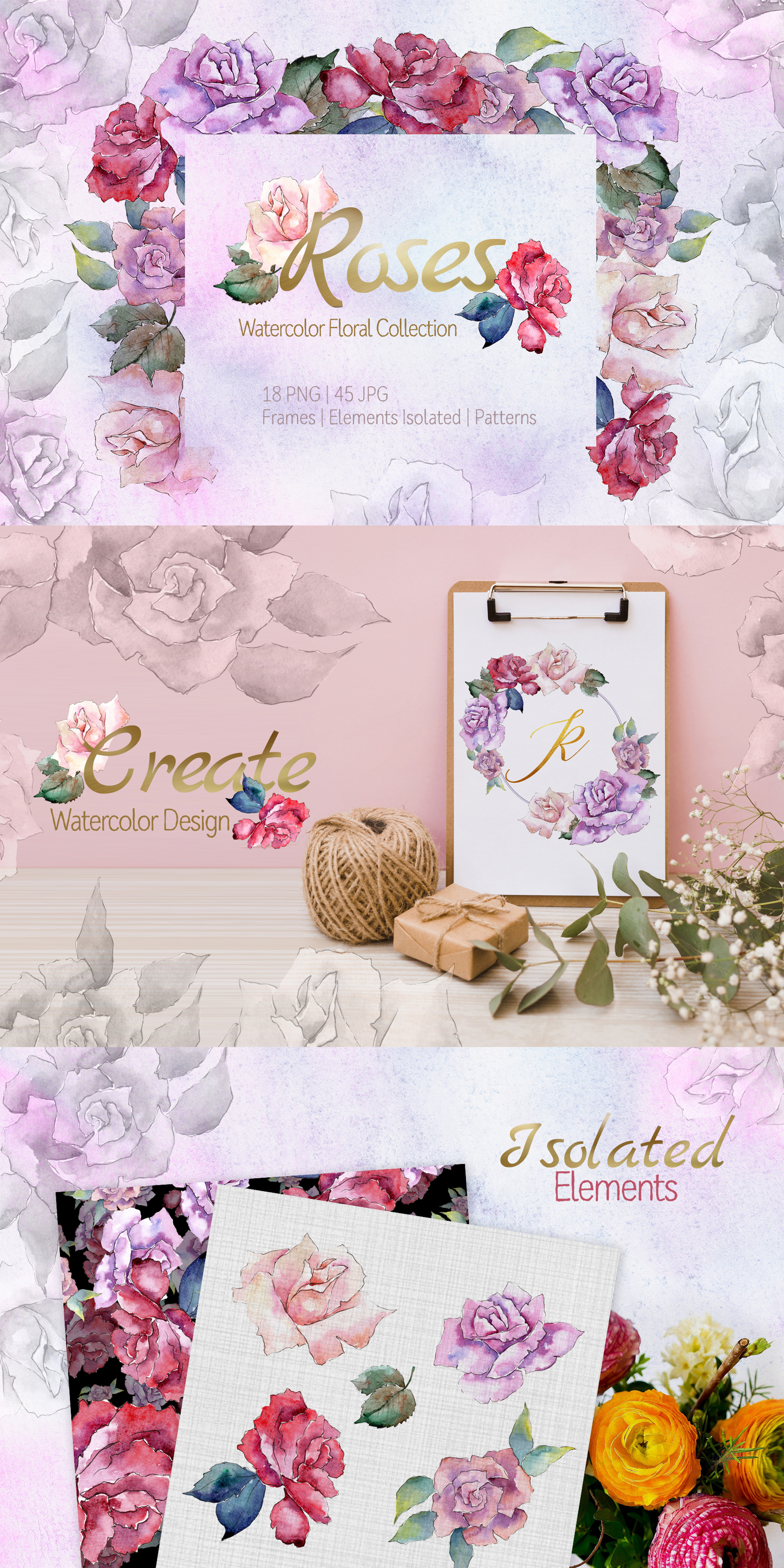 ROSES Watercolor png clipart of 63 files. Ideal material for DIY, wedding invitations, greeting cards, quotes, blogs, posters and more.
