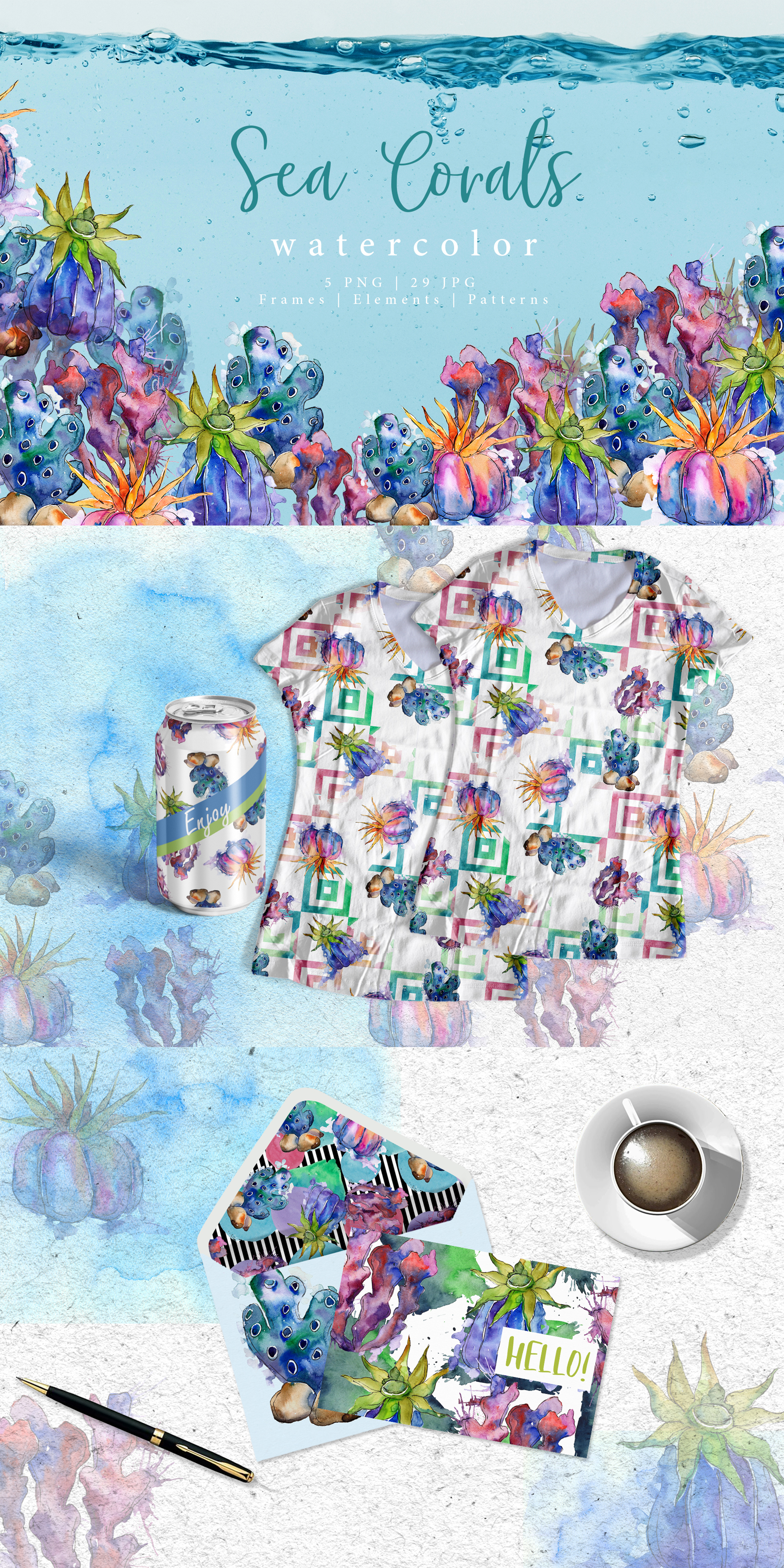 Colorful aquatic underwater nature coral reef a watercolor set of 34 files. Tropical plant sea and ocean water life element. Ideal material for DIY, greeting cards, quotes, blogs, posters and more.