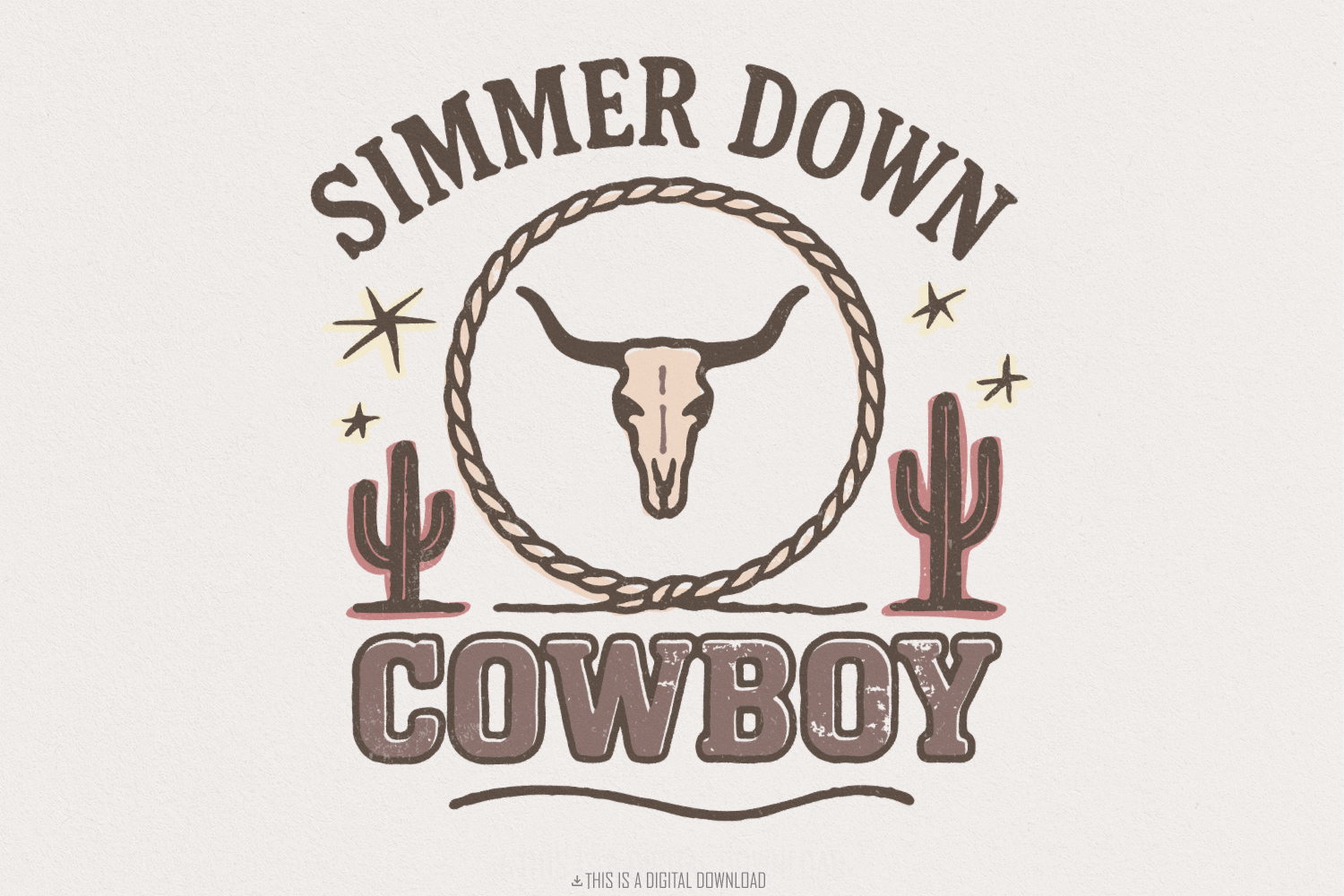 Simmer Down Cowboy PNG, Longhorn Western PNG Tee Design, Retro Desert Cactus PNG, Vintage Cowboy Skull Shirt Digital Download