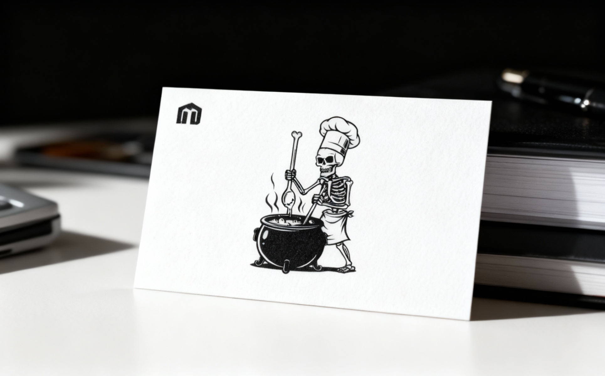 A fun Halloween vector illustration of a skeleton chef wearing a hat, cooking spooky food in a cauldron. The design is entirely black and white with bold vector shapes, perfect for festive product packaging, posters, and creative branding.
