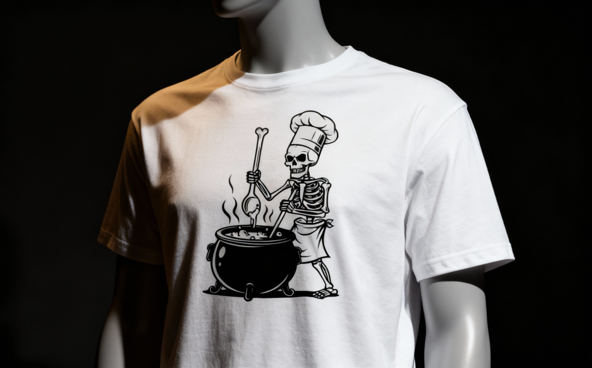 Halloween skeleton chef design featuring an undead cook stirring a spooky dish in a cauldron. Perfect for tshirts, stickers, posters, and party designs. Clean vector style, bold outline, detailed bones, and strong character theme made for fun horror merchandise. Ideal for Halloween events, food humor graphics, and creative print on demand products.