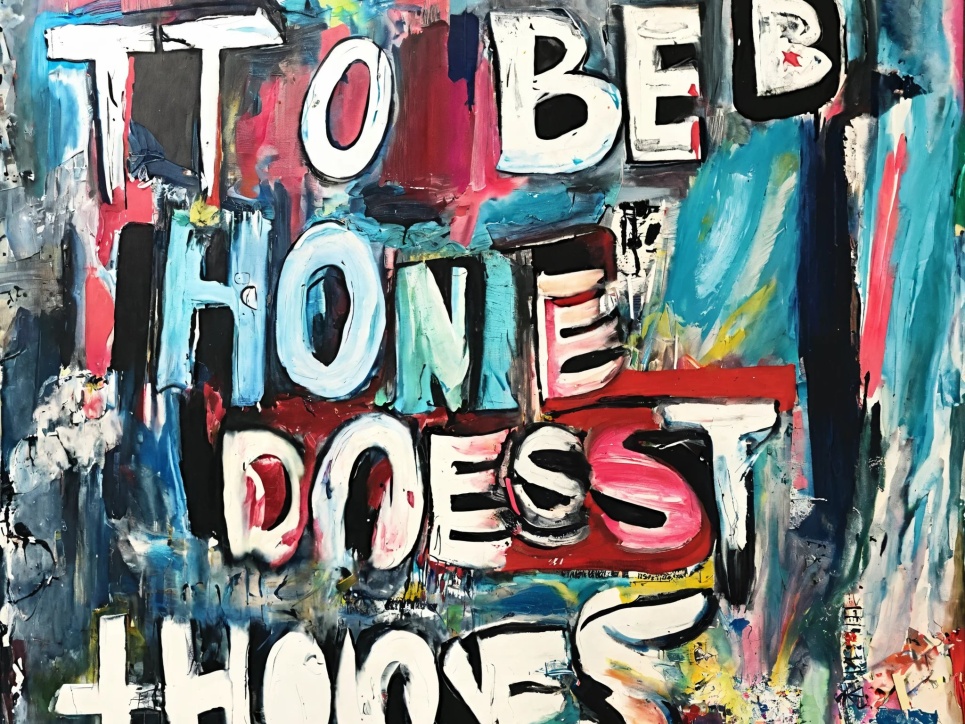 The top-left piece features a lone figure beneath a luminous full moon, surrounded by swirling clouds in rich crimson and teal tones. The top-right artwork boldly declares "TO BE HONEST HOMES" in graffiti-style lettering, blending urban energy with emotional vulnerability.