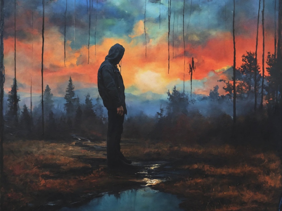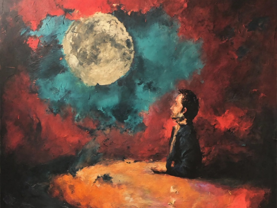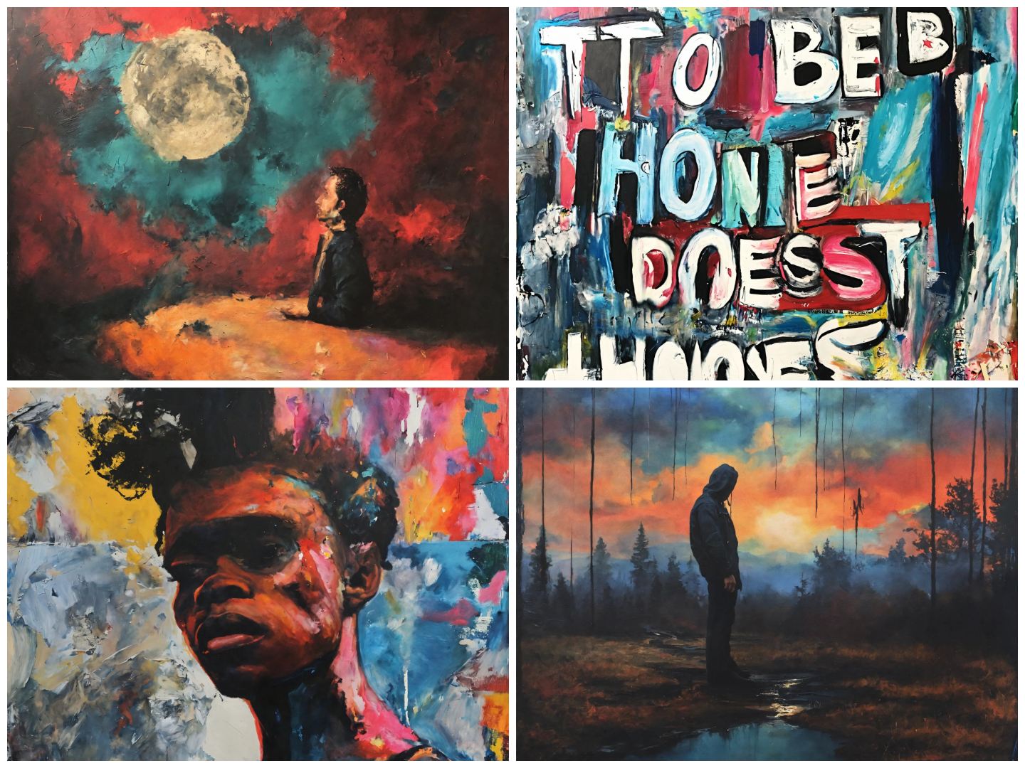 This captivating four-piece collection explores the profound theme of solitude and introspection through AI-generated artistry. Each panel tells a unique story of human contemplation against dramatic backdrops - from moonlit landscapes to vibrant abstract expressions.