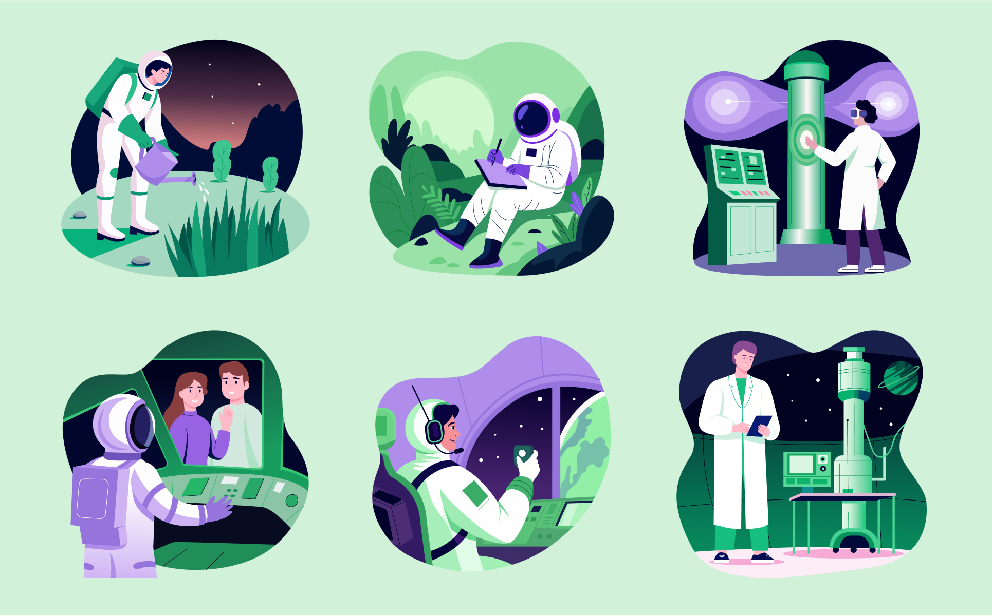 Unleash your creativity and journey beyond the stars with this space and sci fi illustration set From distant galaxies to futuristic cities, this collection brings cosmic adventures to life. Whether you are designing for games, branding, storytelling, or digital art, these illustrations capture the essence of space exploration and sci fi wonder. Let your imagination soar with alien landscapes, high-tech inventions, and intergalactic mysteries, perfect for visionary creators ready to explore the unknown.