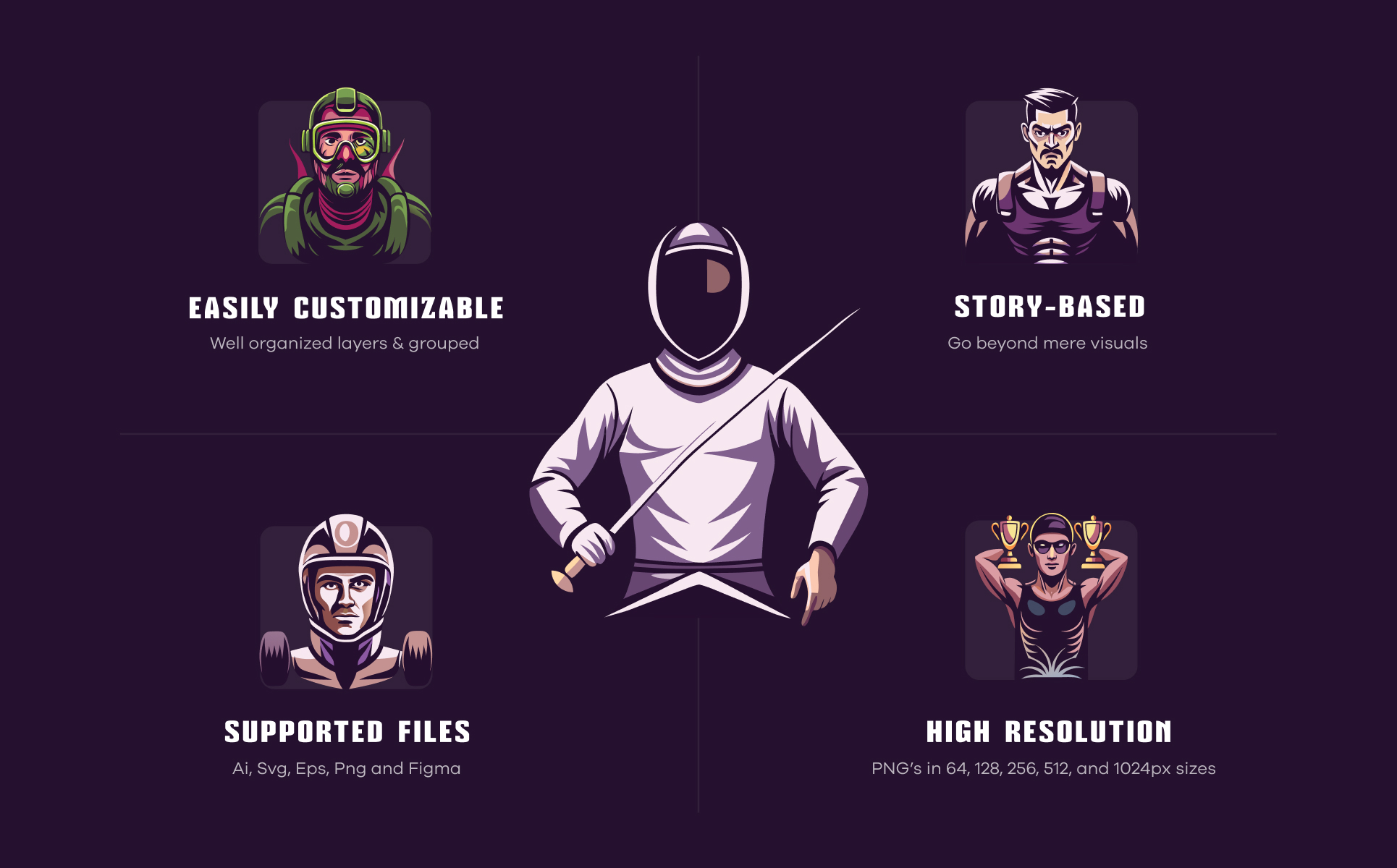 - High-quality sports characters in AI, EPS, Figma, SVG, JPG, and PNG formats.