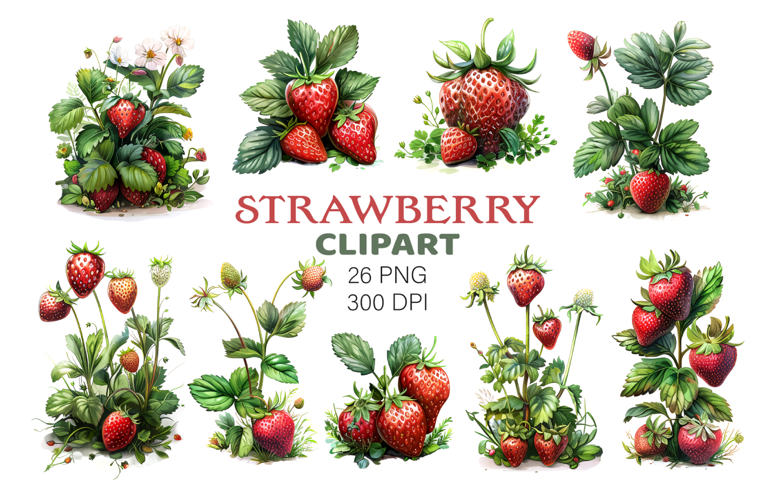 Collection of strawberry PNG images. Berries with leaves and flower clipart. Cute strawberry clipart. Summer gardening. Use the product to print on clothing, t-shirts, labels and stickers, nursery decorations, invitation cards, scrapbooking, journals and more.
