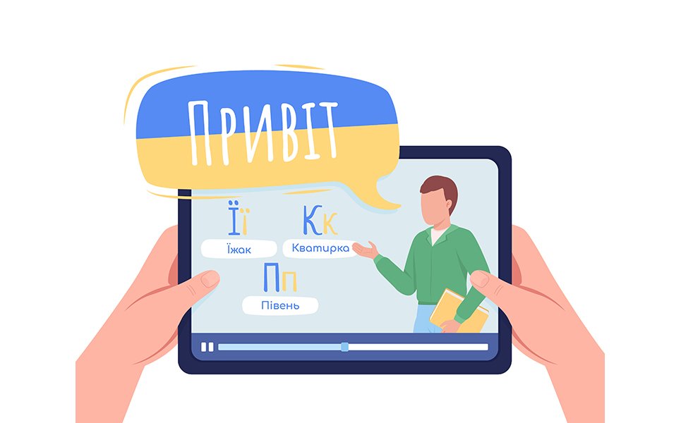 Student learning Ukrainian language with online tutor semi flat color vector characters. First view hand on white. Simple cartoon style illustration. Amatic SC, Comfortaa, Neucha fonts used