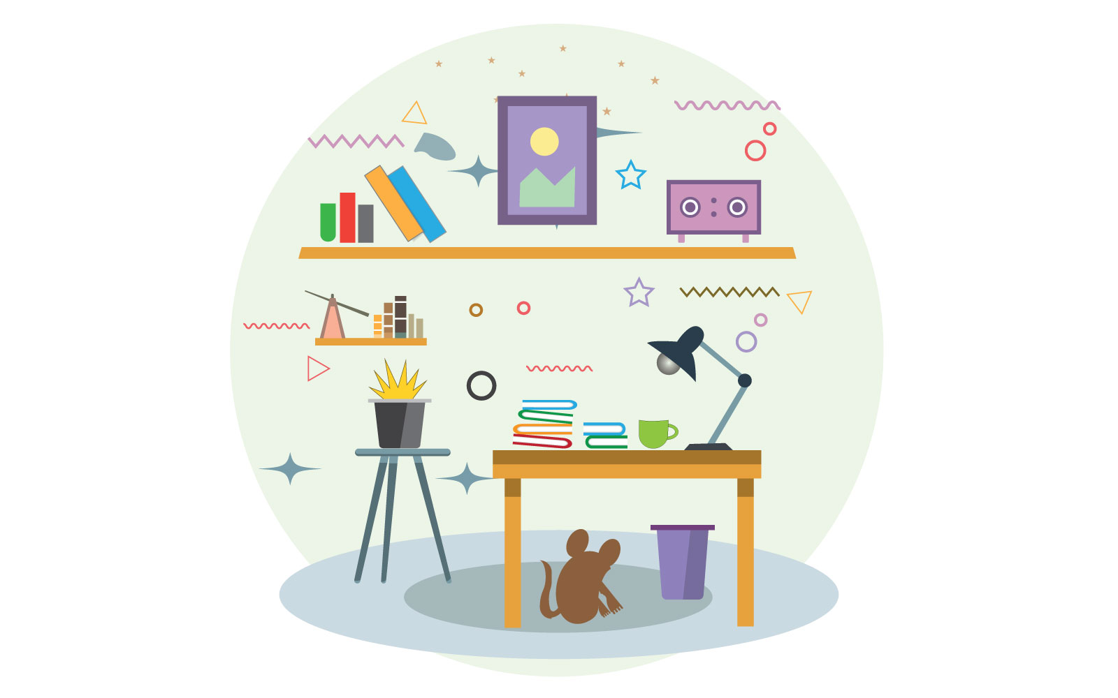 Student workplace with lamp and books. vector hand drawn workspace flat illustration.