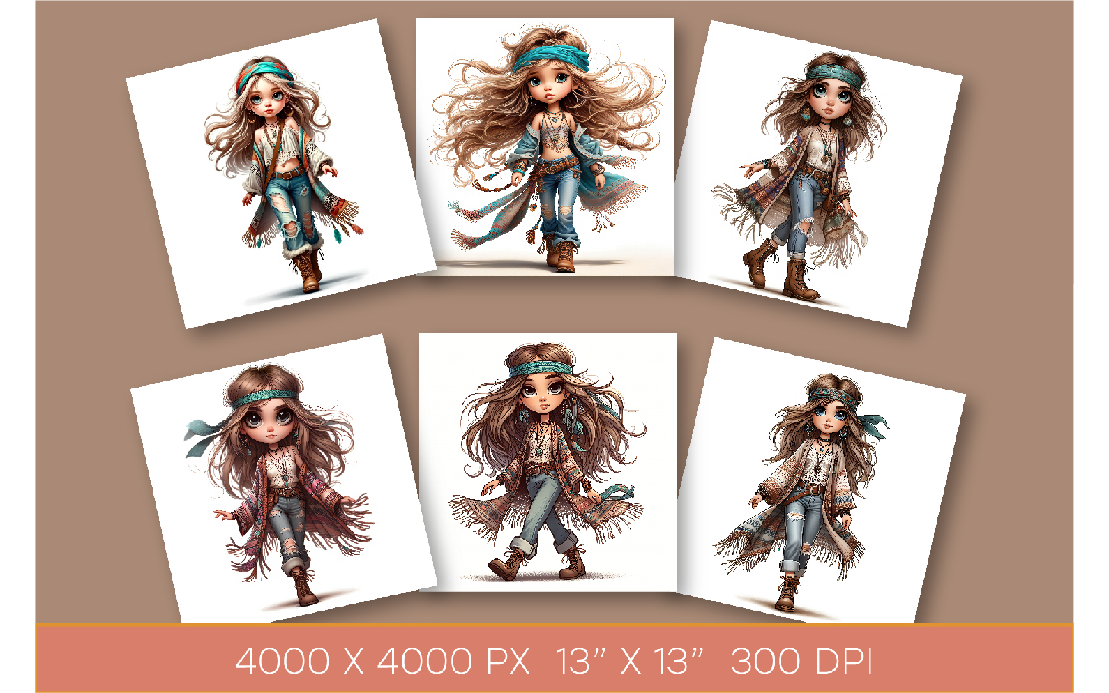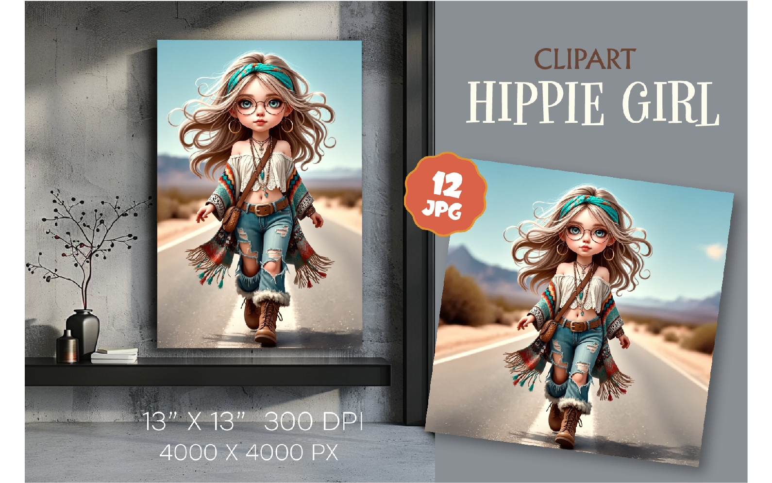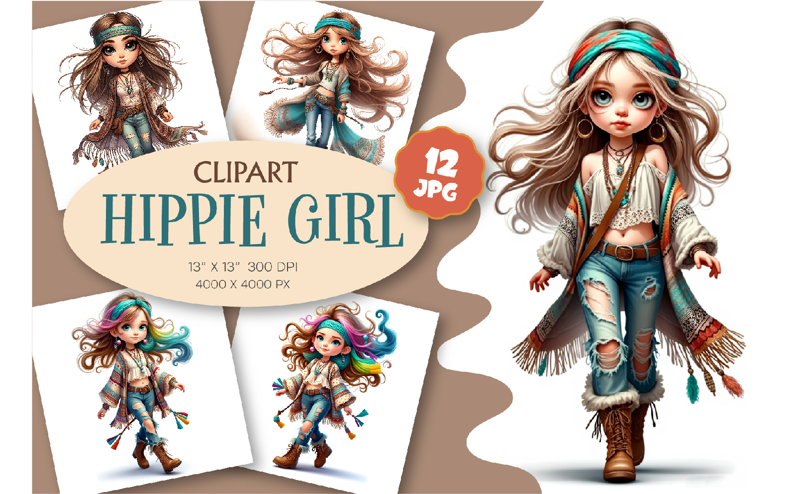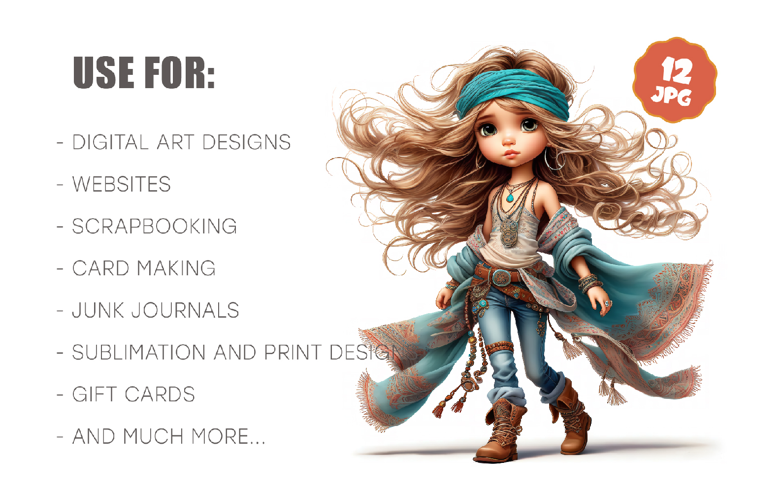 Stylish Hippie Girl Clip Art Set of 12 JPG files, cute fancy boho girl clip art, cute hippie girl clip art.