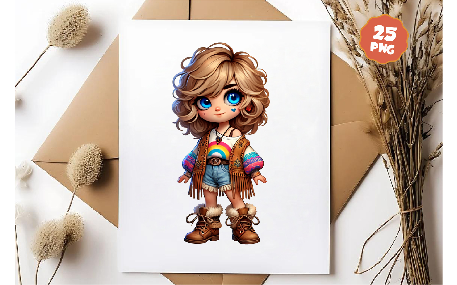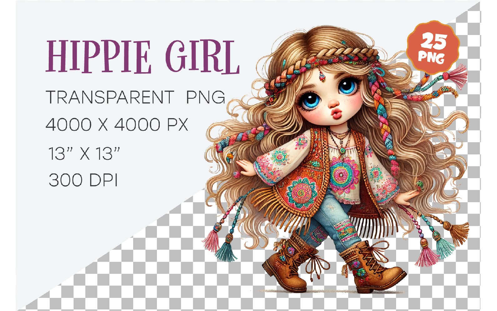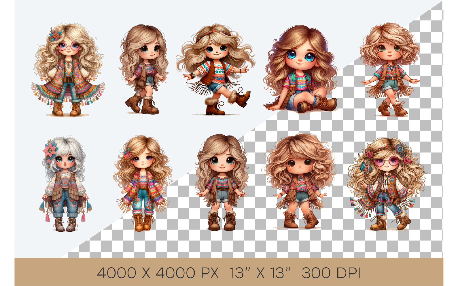 Stylish Hippie Girl Clip Art Set of 25 PNG files, cute fancy boho girl clip art, cute hippie girl clip art.