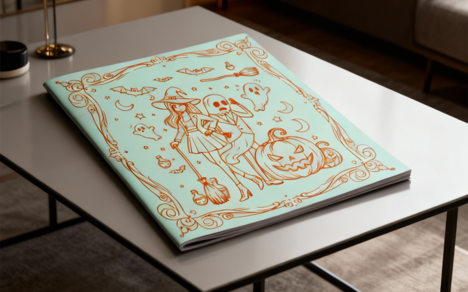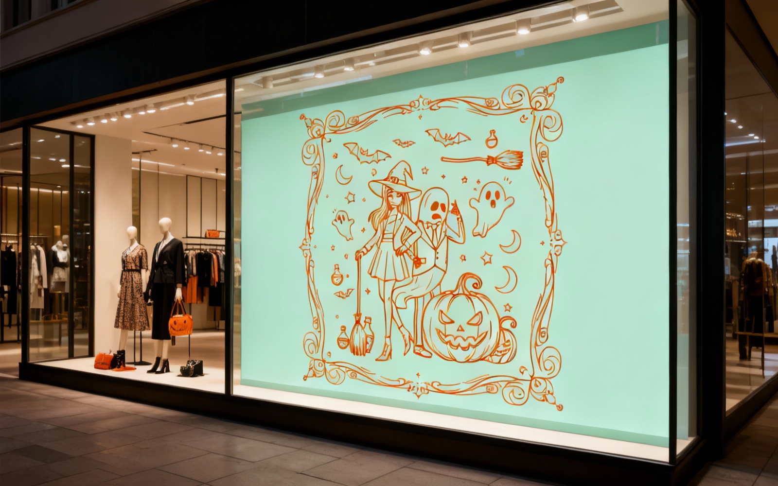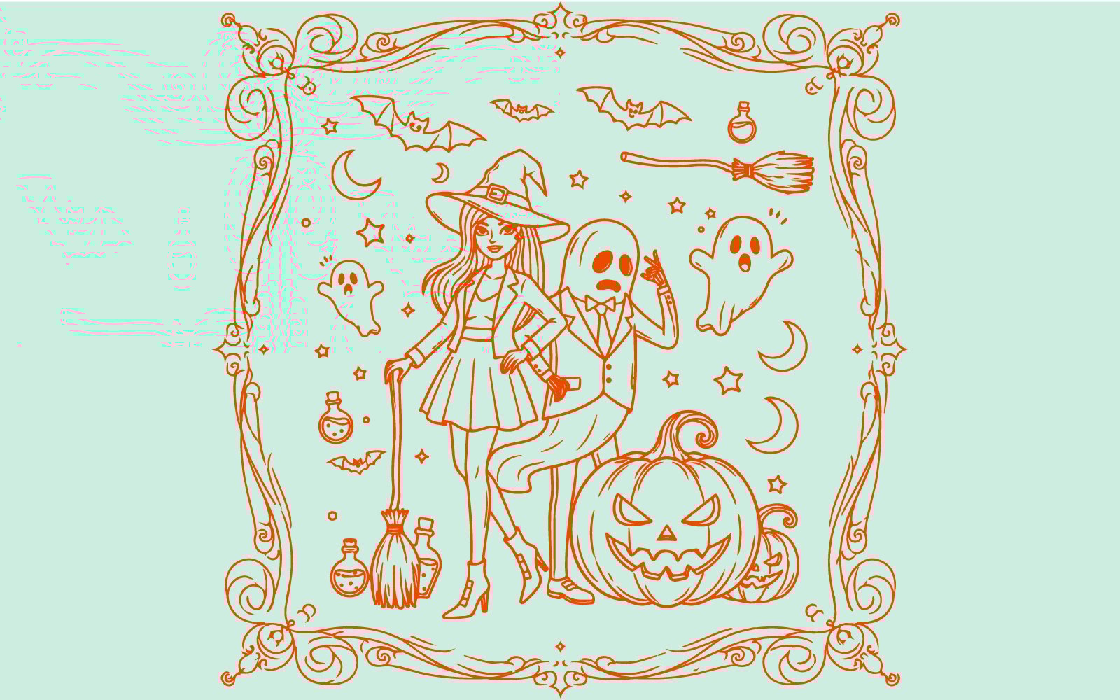 This premium Halloween illustration features two confident female characters with a fashionable and mysterious aesthetic, surrounded by spooky carved pumpkins and Halloween elements. Designed in a bold graphic style with strong shapes and dramatic contrast, this artwork brings modern elegance to the Halloween theme.
