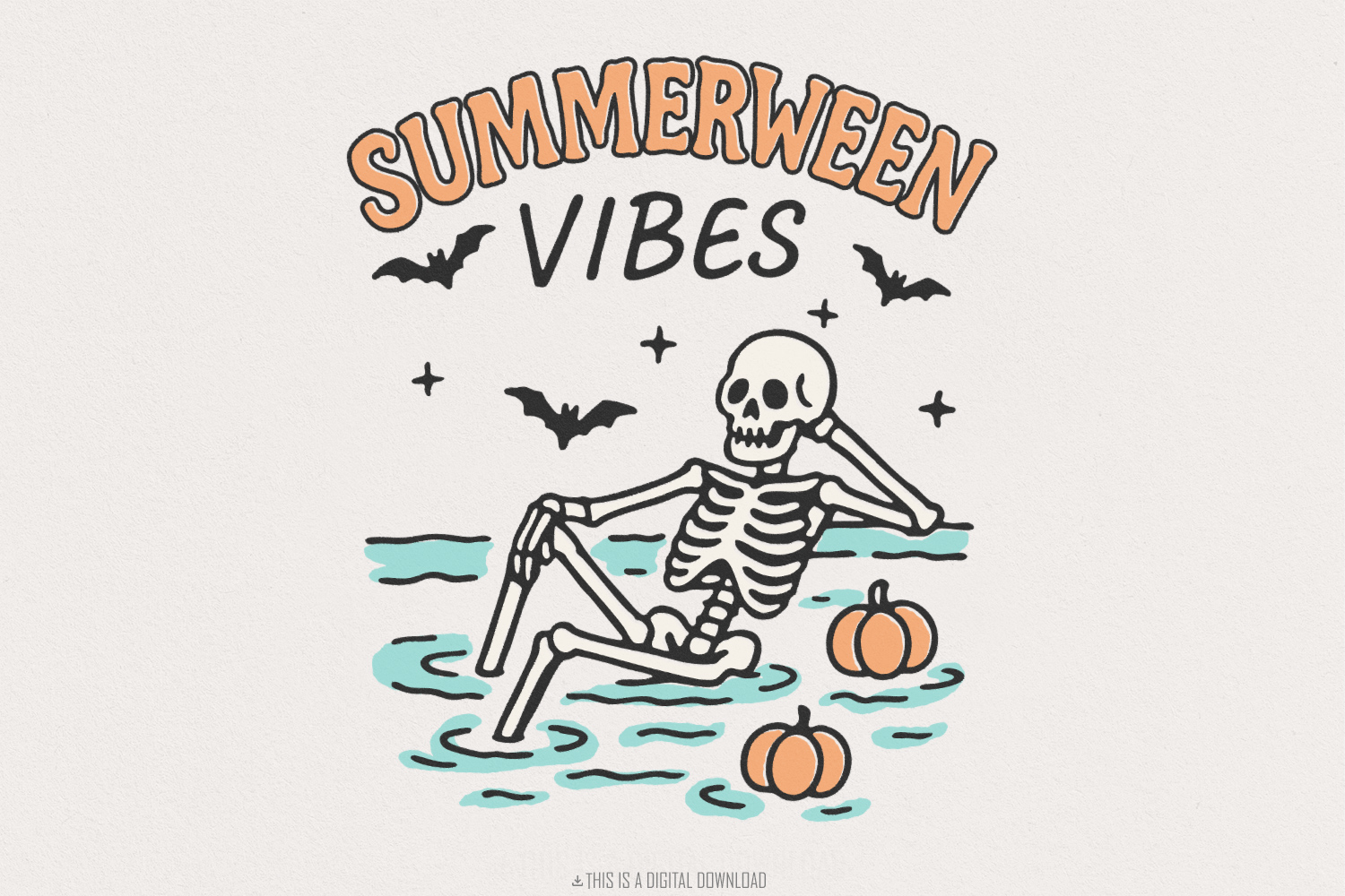 Summerween Vibes PNG, Skeleton Pool Halloween, Cute Spooky PNG, Summer Halloween Shirt, Floating Skeleton Art, Bat Pumpkin Illustration