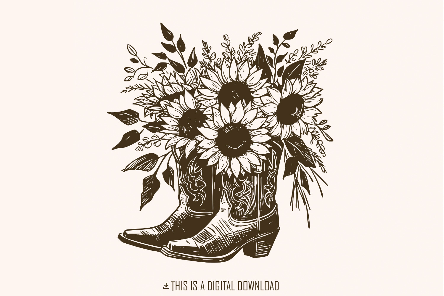 Sunflower Cowboy Boots png PNG, Retro Cowgirl Boot Clipart, Vintage Flower Western Illustration, Print Design