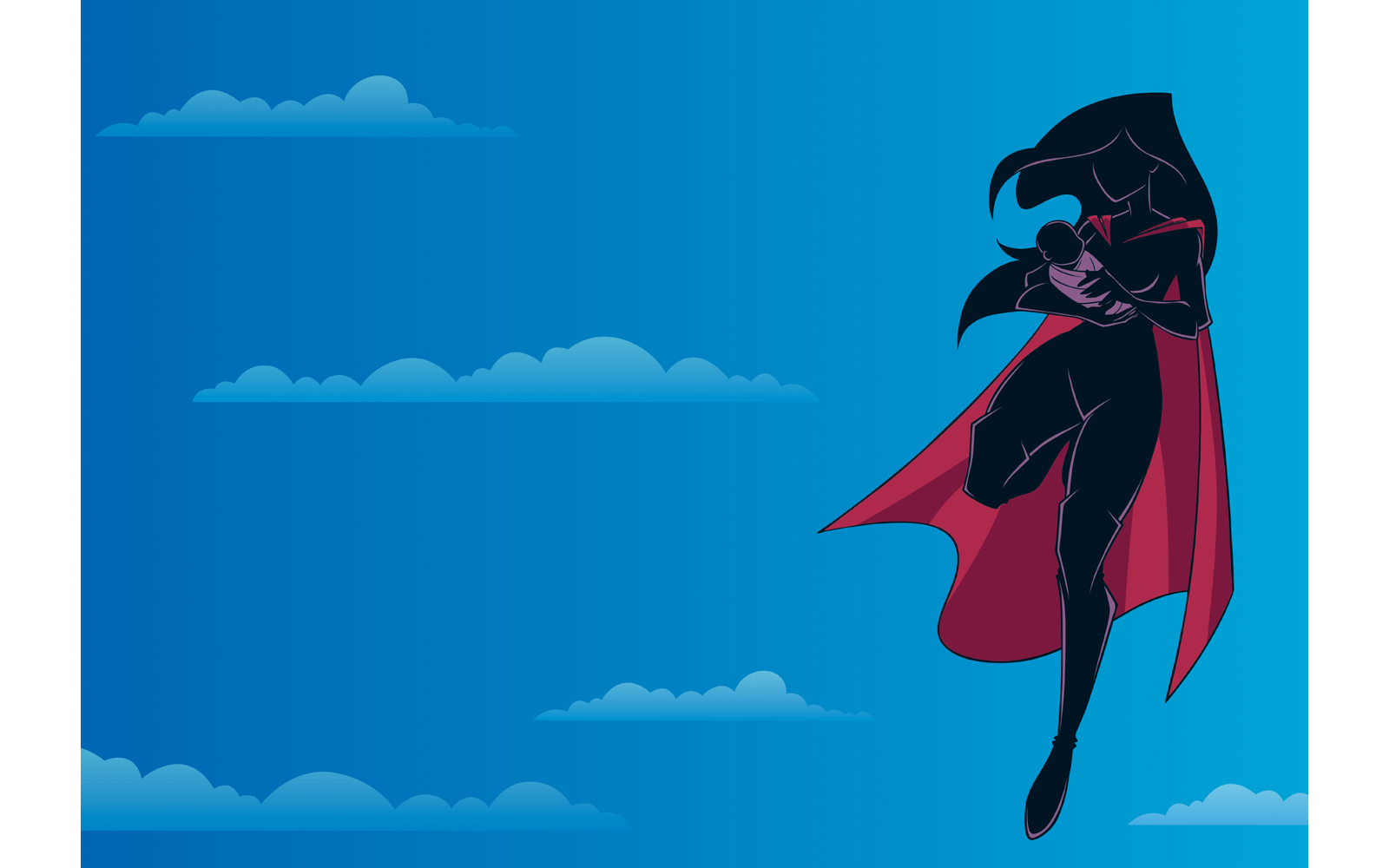 Full length silhouette illustration of superheroine mom flying in the sky and holding her cute newborn baby in her arms.