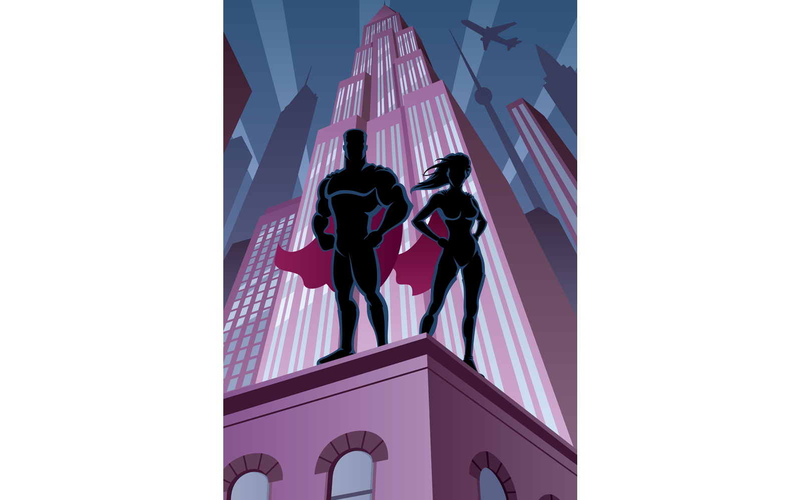 Superhero couple watching over the city. No transparency used. Basic (linear) gradients. A4 proportions.