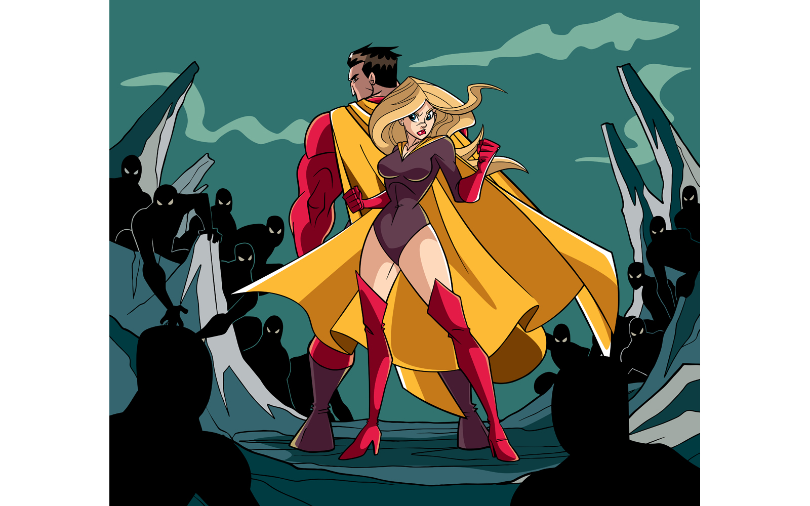 Dramatic fictional scene with a super heroine with her brave and powerful partner standing together against dangerous dark creatures.