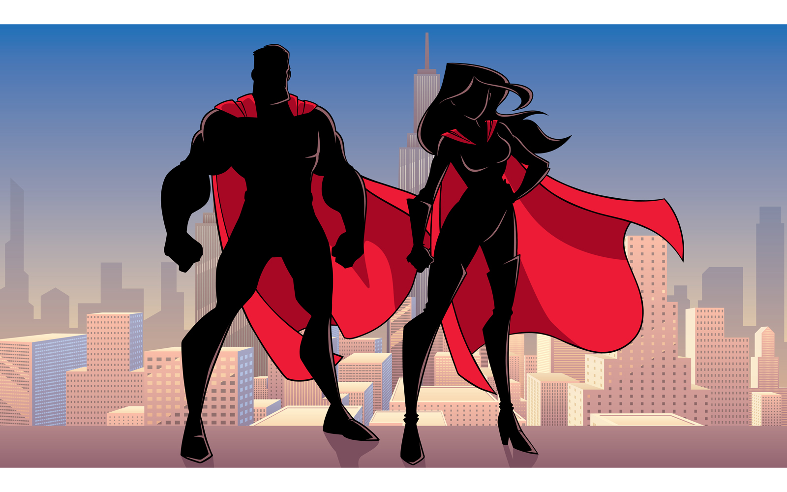 Illustration of silhouette superhero couple, standing tall on rooftop above city.