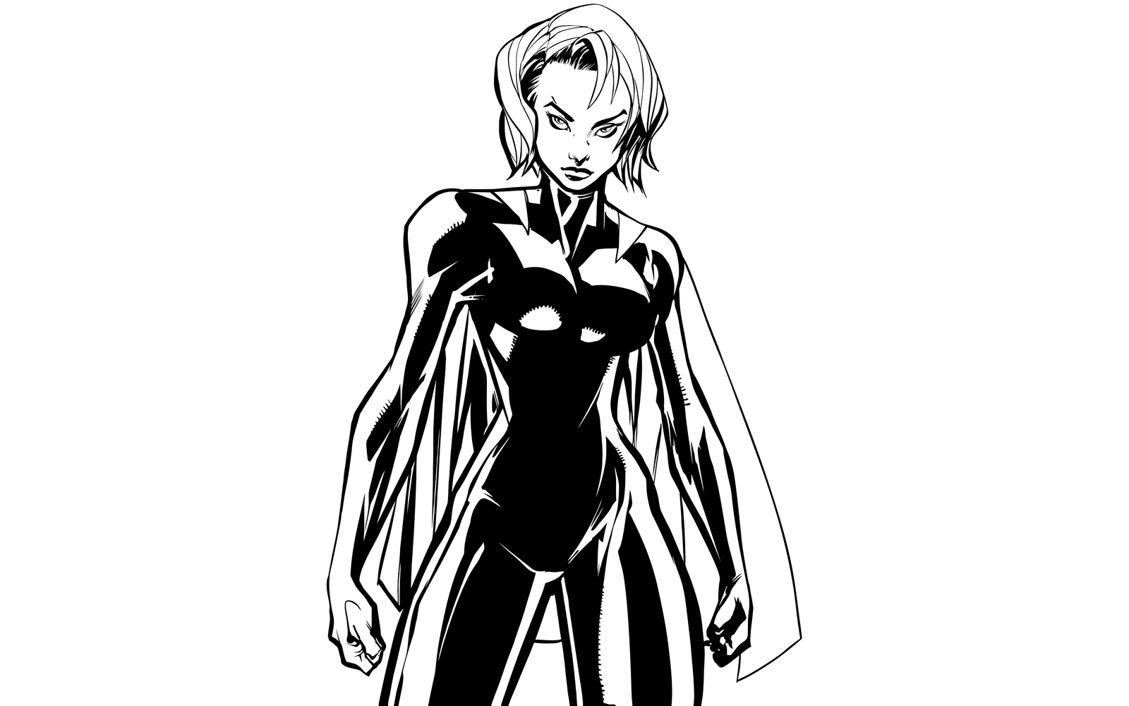 Line art illustration of powerful superheroine ready for battle.