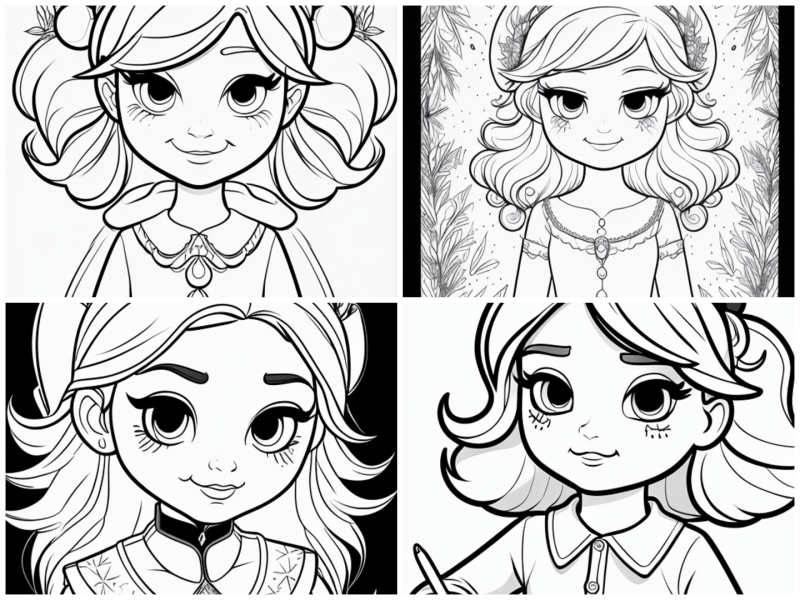 This delightful collection showcases the magic of AI art meeting childhood wonder! These four charming illustrations feature adorable young girls with flowing hair and sweet expressions, each designed in a classic coloring book style. The AI has beautifully captured that timeless appeal of simple line art that sparks creativity and imagination. From vintage-inspired dresses to playful pigtails, each character tells her own little story while maintaining the clean, friendly aesthetic that makes coloring such a joy for artists of all ages.