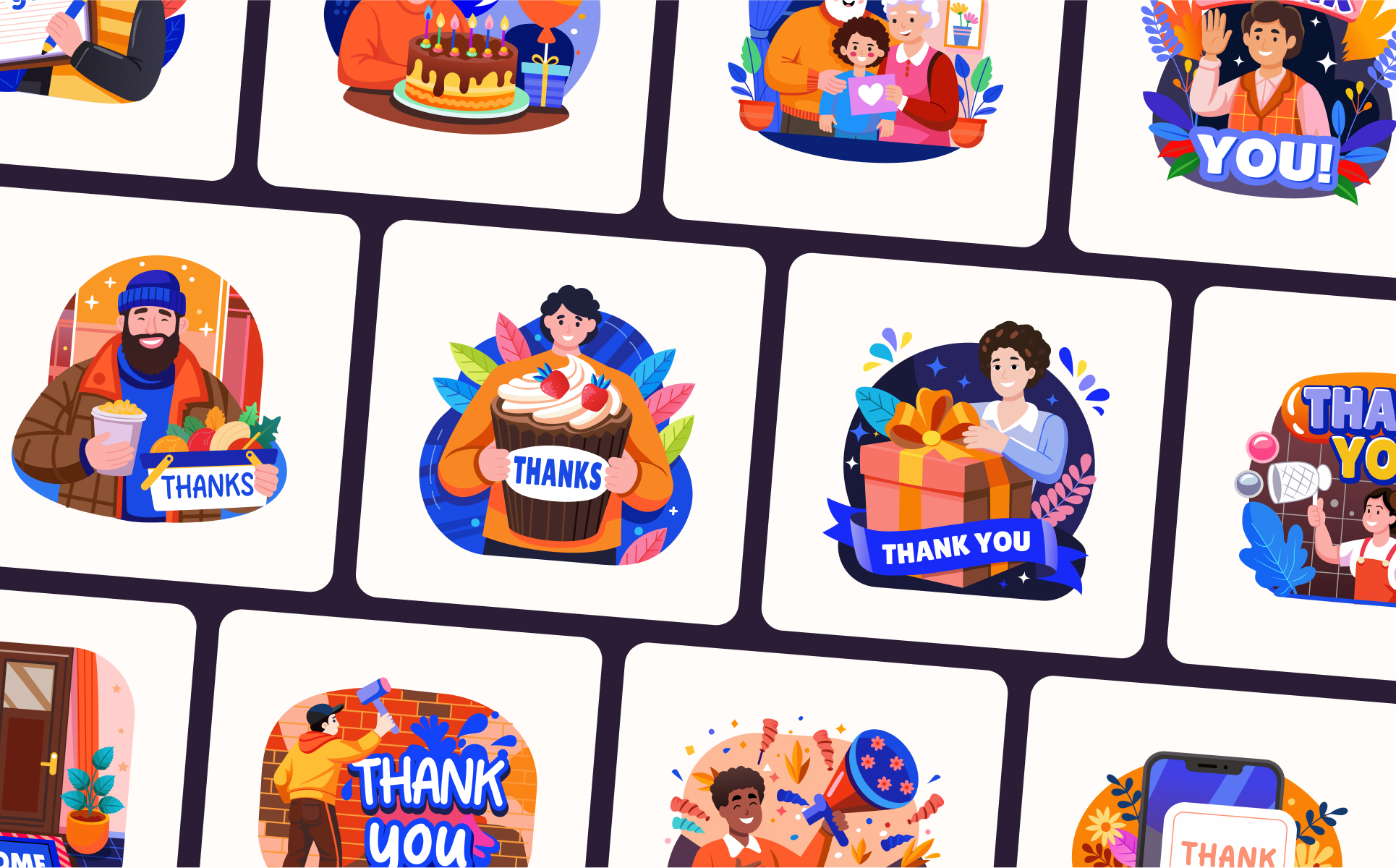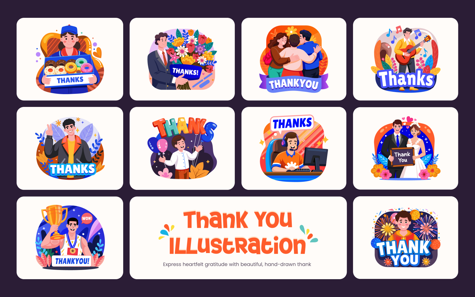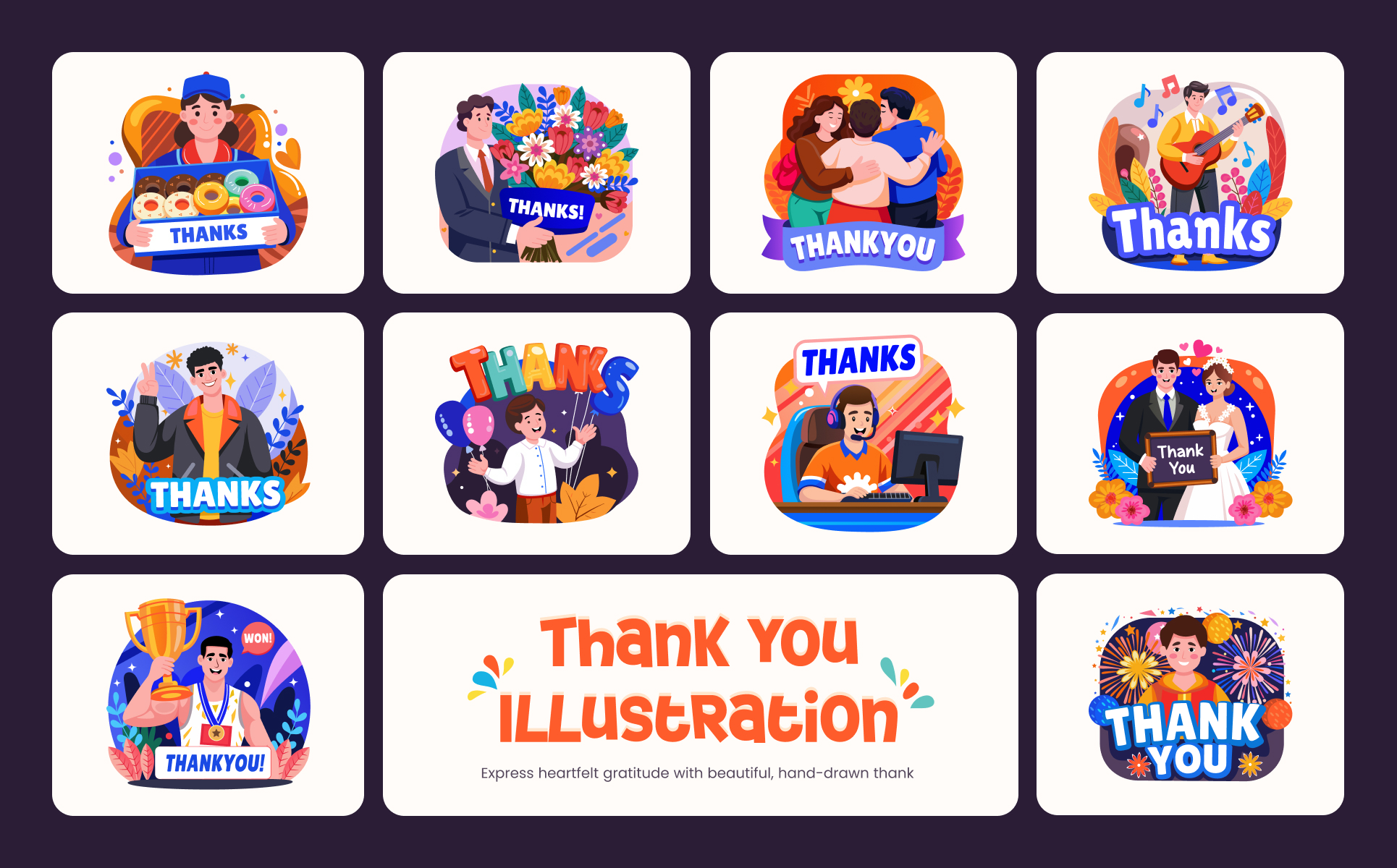 Bring warmth and appreciation to your projects with our Thank You Illustration Set! Designed in a modern flat style, this pack includes versatile illustrations perfect for thank you cards, social media posts, posters, and creative branding. You can easily customize and use them across all your design needs. Whether you're a designer or a small business owner, this set makes saying “Thanks” look amazing.