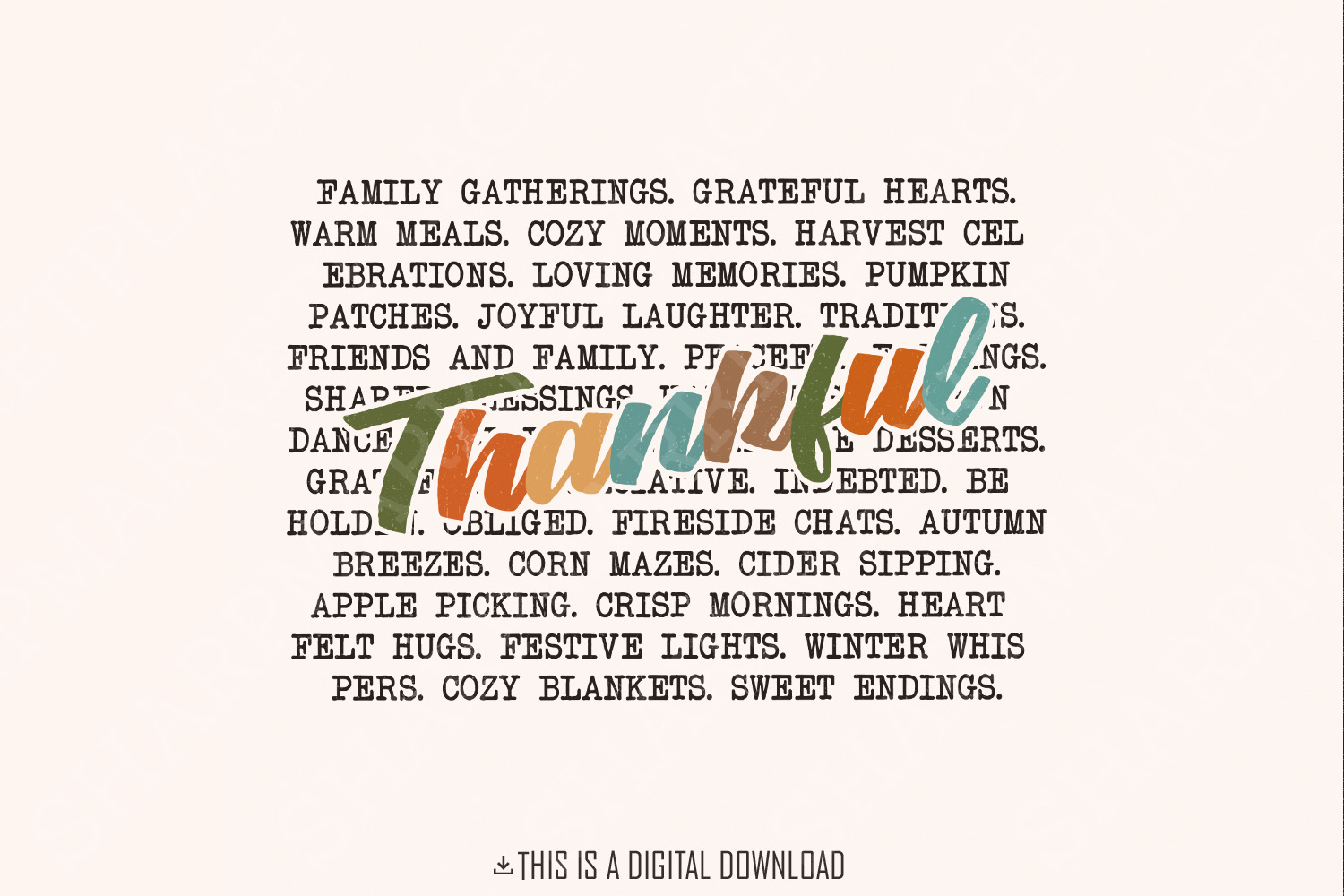 Thankful Words PNG, Thanksgiving png, Fall Shirt Design, Autumn Fall Sublimation, Pumpkin png, Cozy png, Retro Fall Design, Digital Download
