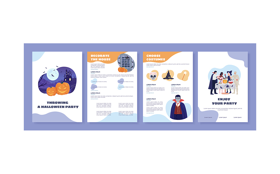 Throwing Halloween party flat vector brochure template. Booklet, leaflet printable flat color designs. Editable magazine page kit with text space. Sigmar One, Balsamiq Sans, Comfortaa fonts used